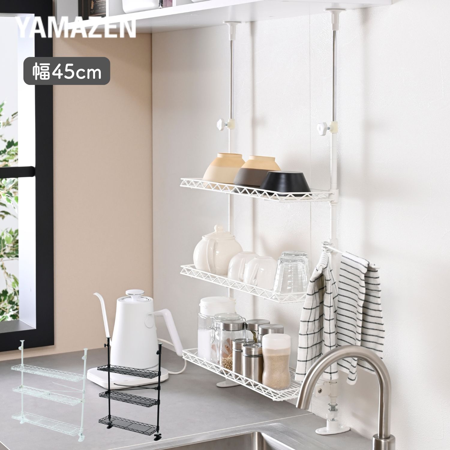 シンク上 突っ張り キッチンラック 幅45 シンクサイド 可動棚 跳ね上げ 収納 スリム 隙間 すき間 ラック 調味料ラック スパイスラック 3段 山善 YAMAZEN