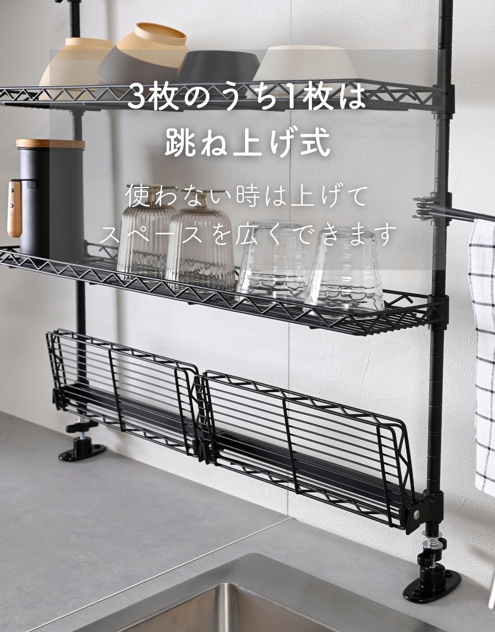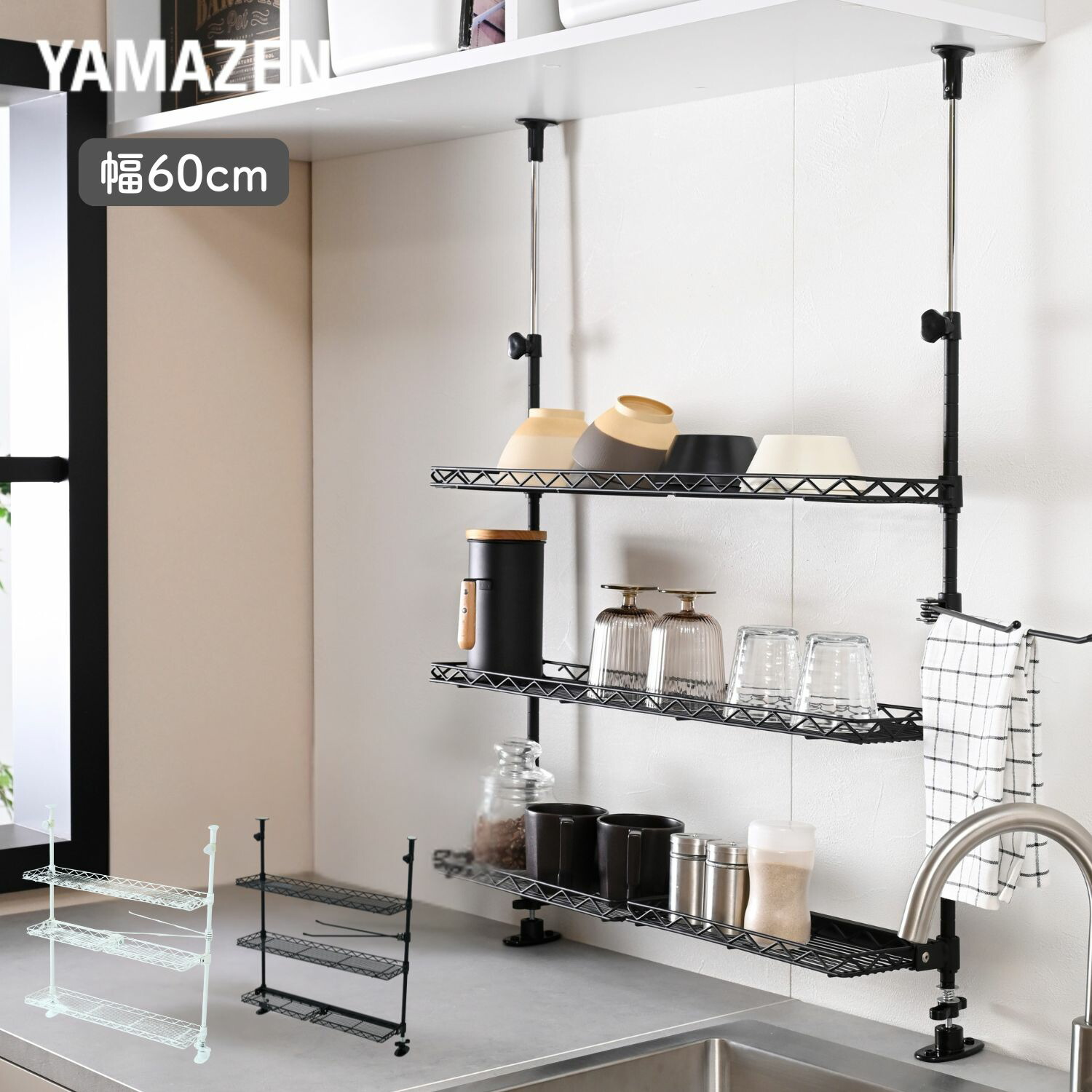 シンク上 突っ張り キッチンラック 幅60 シンクサイド 可動棚 跳ね上げ 収納 スリム 隙間 すき間 ラック 調味料ラック スパイスラック 3段 山善 YAMAZEN