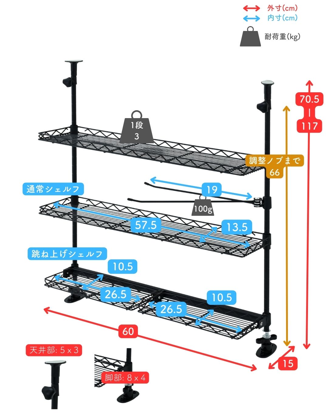 幅60×奥行15×高さ70.5-117cm 重量3kg