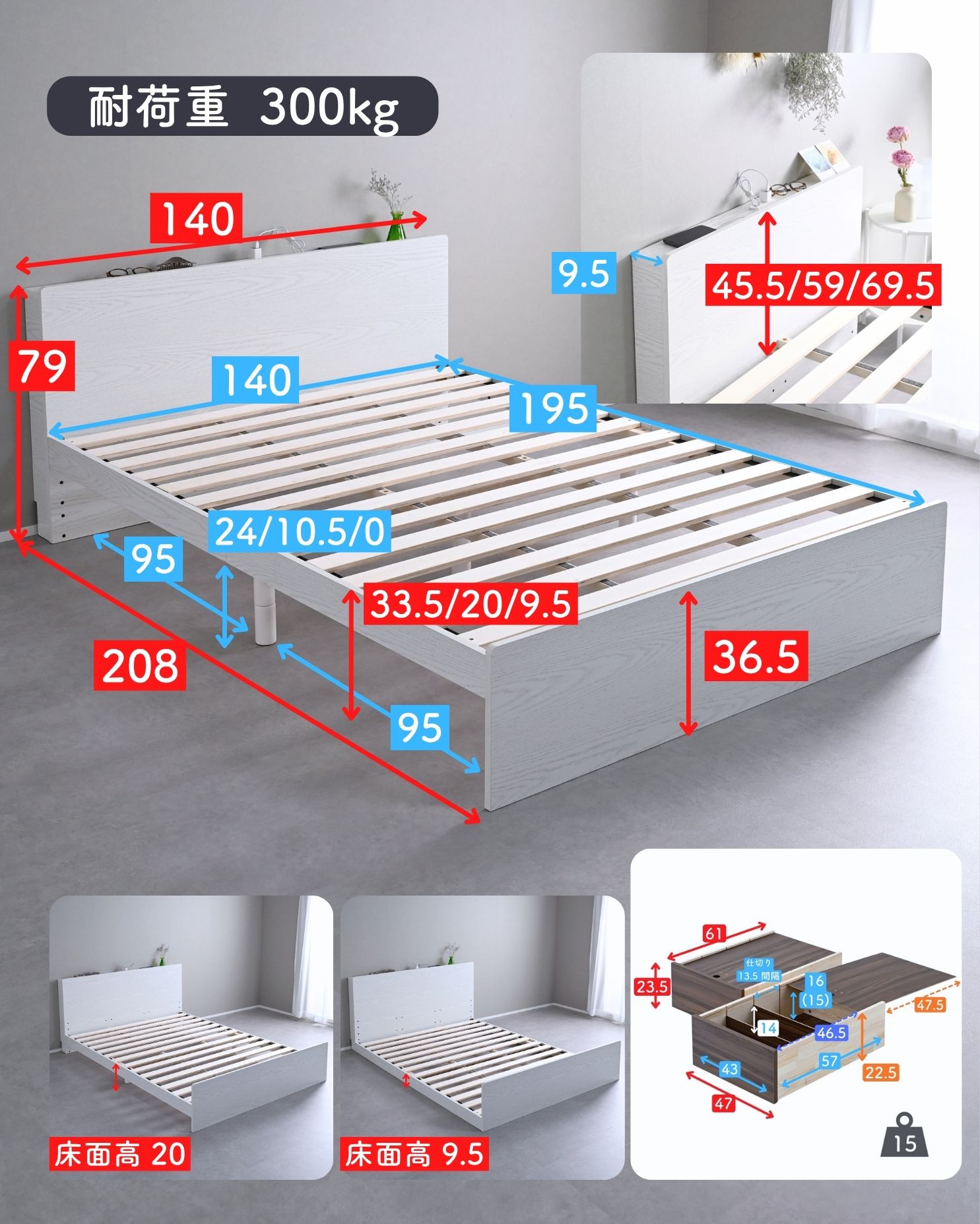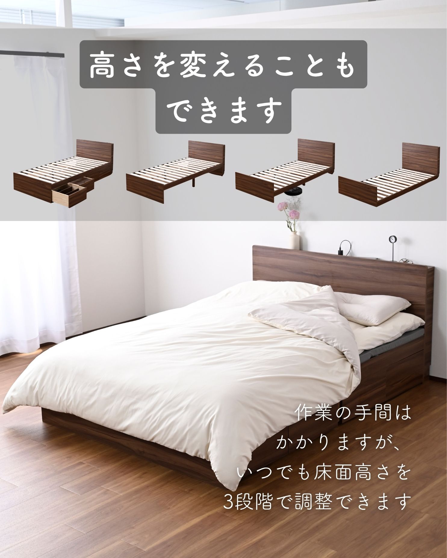 ●ベッドは床面高さを3段階に調節可能