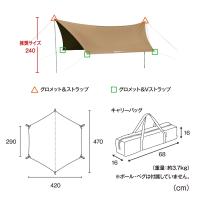 特徴:W470cmあるので、日陰も広く余裕のレイアウトができます。タープ下にドームテントを設営したカンガルースタイルも可能。ポール推奨サイズは240cmですが、210・180cmでも設営はできます。設営場所・環境条件に応じて選んでください。