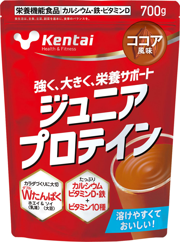 ケンタイ Kentai ジュニアプロテイン ココア風味 700g ホエイ ソイ 大豆 トレーニング フィットネス たんぱく質 カルシウム ビタミンD K2203 成長期にあるジュニア世代に向けて、カラダづくりに大切な栄養がしっかりとれるプロテインです。毎日飲んでも飲み飽きない、やさしい甘味のココア風味のプロテインです。水、牛乳ともおいしくお召し上がりいただけます。1日21gを目安にお召し上がりください。