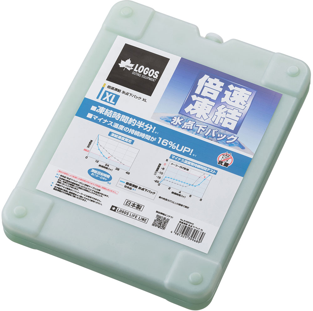ロゴス LOGOS 倍速凍結・氷点下パックXL 保冷剤 冷却 強力 キャンプ BBQ バーベキュー 調理 料理 クッキング 長時間保冷 天然素材 防災 停電対策 災害対策 台風対策 81660640 アウトドア 一般的な保冷剤の約8倍もの冷却能力を誇る、圧倒的な冷却力。しかも、事前の凍結時間は約18〜24時間と、従来品の約半分になった[氷点下パックシリーズ]のスピード凍結タイプです。食べ物や飲み物はもちろん、冷凍食品やアイスクリームまでしっかり冷やせます。さらに、冷凍庫に常備しておけば、停電時などの緊急時にも庫内の冷たさをキープしてくれます。効果を最大に活かすため、ロゴスの氷点下パックは、容器が[半透明]仕様です。凍結状態を確認することができるので、暑い季節のアウトドアシーンにもパワーを発揮することができます。凍結前は透明感がありますが、凍結すると、白っぽく変化するので、見た目でわかり便利です。