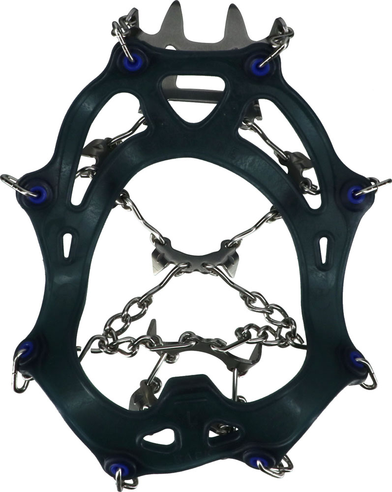 チェーンセンプロと同じ素材で合計14本の爪があります。靴底の前8本、かかかと4本の爪はしっかりと雪面へ食い込み、斜面の登行時には軸足側のつま先の2本の前爪が有効です。沢登りの草付きでの使用も可能です。アイレットと同色パイピングカラーの専用ケース付き。