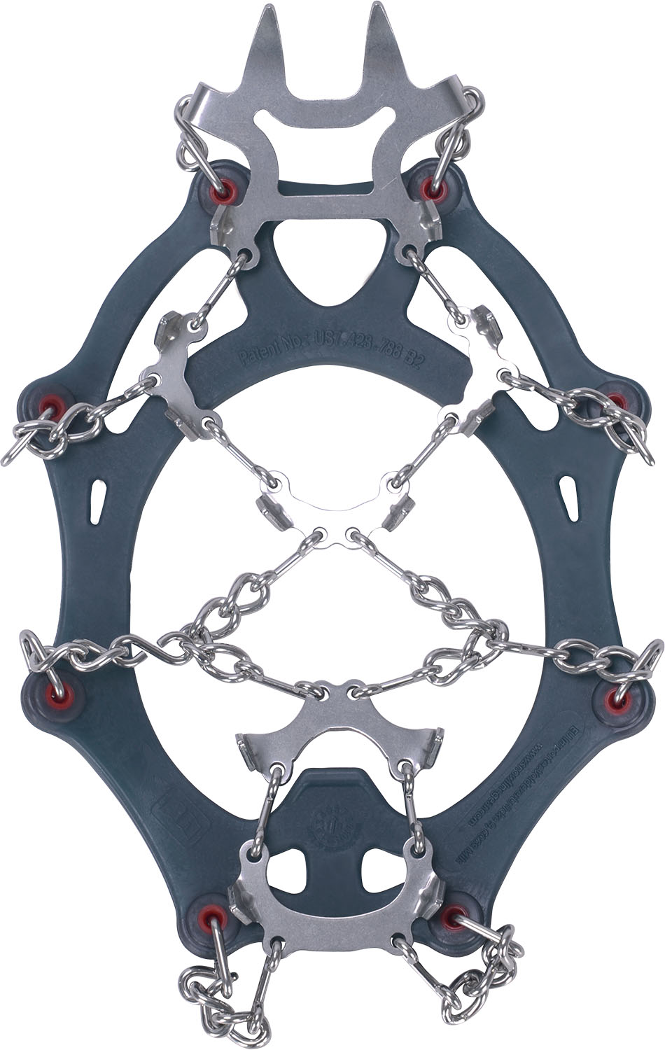 チェーンセンプロと同じ素材で合計14本の爪があります。靴底の前8本、かかかと4本の爪はしっかりと雪面へ食い込み、斜面の登行時には軸足側のつま先の2本の前爪が有効です。沢登りの草付きでの使用も可能です。アイレットと同色パイピングカラーの専用ケース付き。