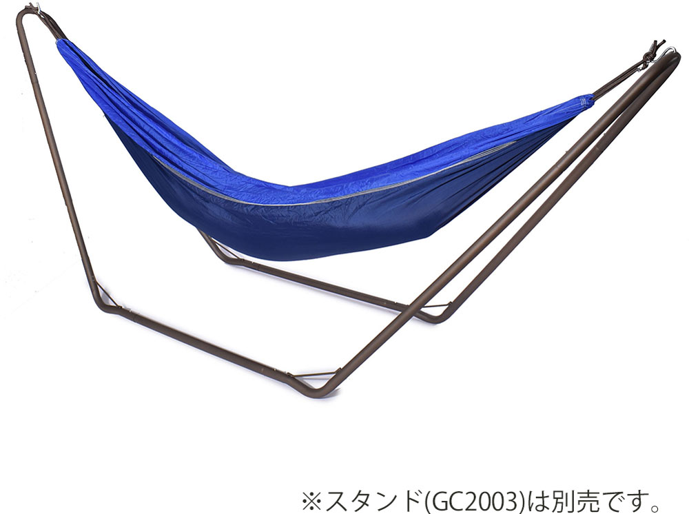 適度な揺れと包み込まれる安心感。アウトドアライフのお供に最適なハンモックです。※この商品はスタンドが付属していません。別売りのシングルハンモックスタンド(GC2003)もしくはツリーストラップ(GC2004)をご購入の上でご使用ください。ハンモックをご使用の際は、同封されている説明書を参考に組み立てを行ってください。