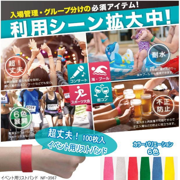 | イベントの入場管理や スタッフ証、グループ分けなど利用シーンが増えつつある、耐久・耐水性に優れたタイベックR製の高密度ポリエチレン 不織布を使用した「イベント用リストバンド 使い捨てタイプ100本入 | | 商品名 | イベント用リストバンド 使い捨てタイプ100本入 | | 品番 | NF-3567 | | サイズ | 約)長さ255×幅20mm 厚さ0.17mm | | 仕様 | 同色 100本入り | | 材質 | PE(不織布) | | メーカー | ソニック | イベントの入場管理やスタッフ証、グループ分けに最適 強度・耐久性能に優れた丈夫なタイベックR製 ・一度外すと再装着不可能ですので不正入場などの防止に役立つ ・防水性能に優れており海やプールでも使用できる ・豊富なカラーバリエーションはスポーツ大会などグループ分けにも最適 ・油性ペンで文字を書いたり油性スタンプで印を付ける事が出来る | | ※他のモール及び店頭売りと在庫を併用しておりますのでご注文後でも在庫切れの場合がございますのであらかじめご了承下さい。 | |