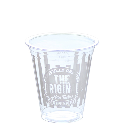 ■コールドドリンクだけでなく、パフェ・デザートやカットフルーツにもフィットするオリジナルストライプ柄のテイクアウ用プラカップです。