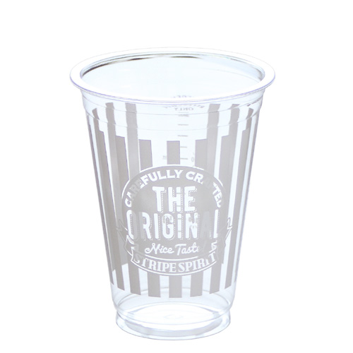 ■コールドドリンクだけでなく、パフェ・デザートやカットフルーツにもフィットするオリジナルストライプ柄のテイクアウ用プラカップです。