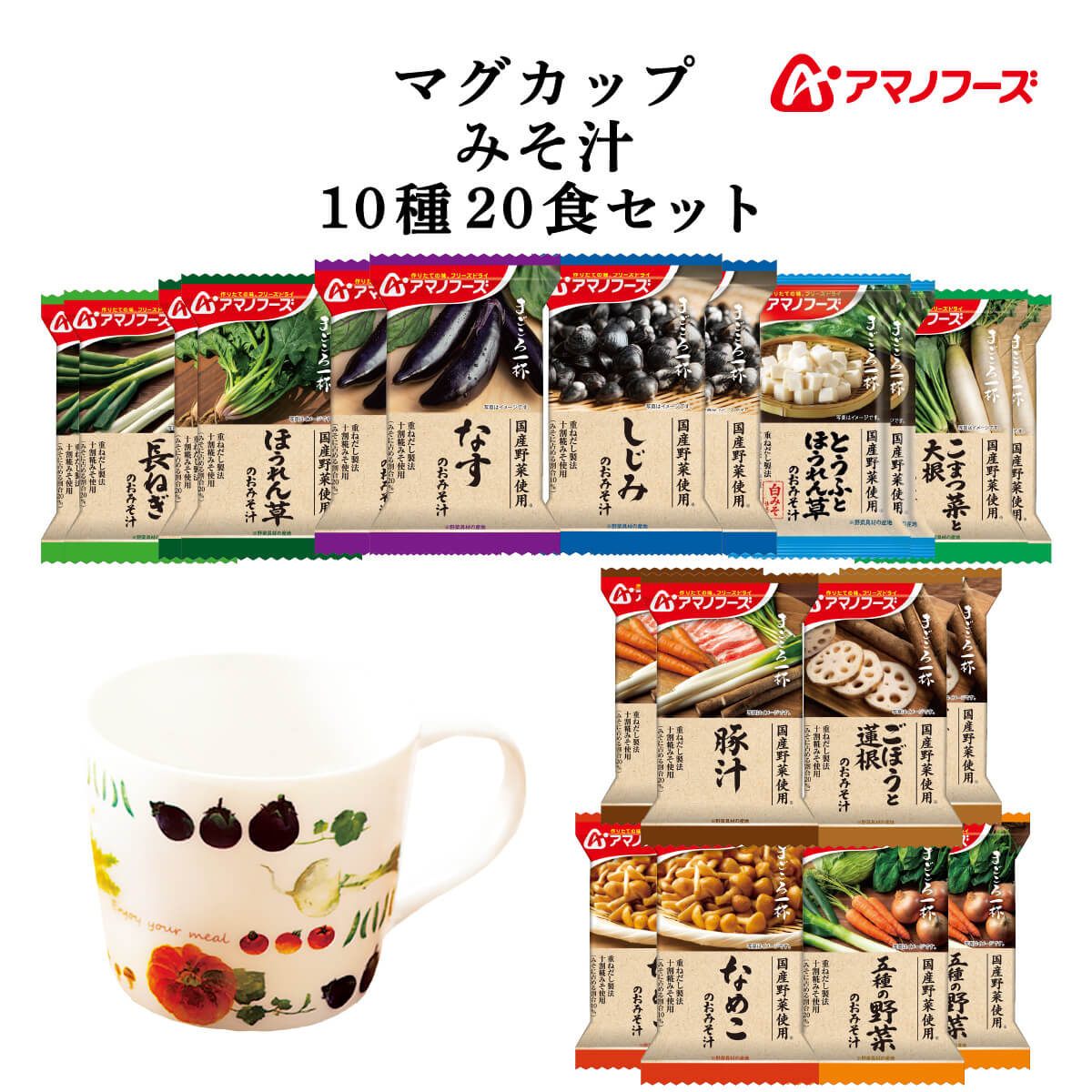 | 内容量 | ■ まごころ一杯 なす 9.8g しじみ 赤だし 15.9g とうふとほうれん草 9.5g ほうれん草 8.5g 小松菜と大根 9.3g 長ねぎ 8.2g とん汁 13.7g ごぼうと蓮根 9.1g なめこ 赤だし 8.3g 五種の野菜 10.5g 10種 各2食 20食 |