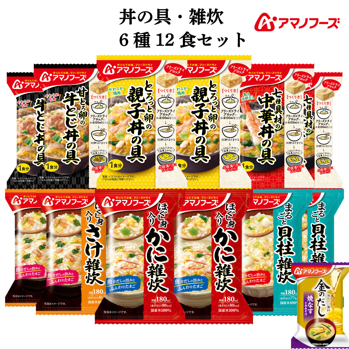 | 内容量 | ■ 雑炊 ほぐし身入り かに雑炊 20.5g ほぐし身入り さけ雑炊 20.7g まるごと 貝柱雑炊 19.8g ■ 丼の具 とろっと卵の親子丼の具 22.5g 甘とろ卵の牛とじ丼の具 23.8g 七種具材の中華丼の具 17g 6種 各2食 合計12食 + 金のだし なす 1食 |