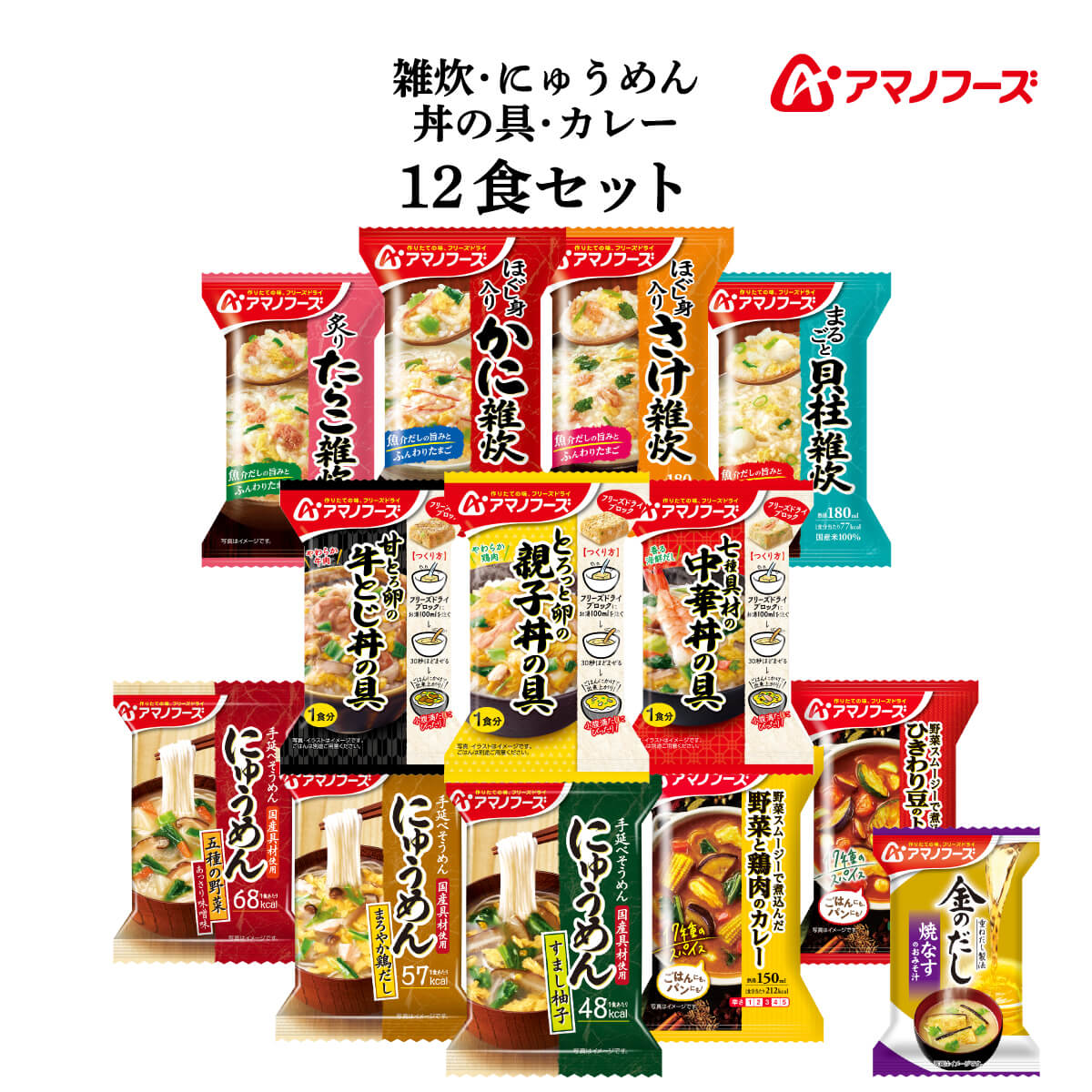 | 内容量 | ■ 雑炊 ほぐし身入り かに雑炊 20.5g ほぐし身入り さけ雑炊 20.7g 炙り たらこ雑炊 21g まるごと 貝柱雑炊 19.8g ■ にゅうめん すまし柚子 13g まろやか鶏だし 15g 五種の野菜 あっさりみそ味 18.5g ■ 丼の具 とろっと卵の親子丼の具 22.5g 甘とろ卵の牛とじ丼の具 23.8g 七種具材の中華丼の具 17g ■ カレー 野菜と鶏肉のカレー 36.4g ひきわり豆のトマトカレー 36g 12種 各1食 合計12食 + 金のだし なす 1食 |