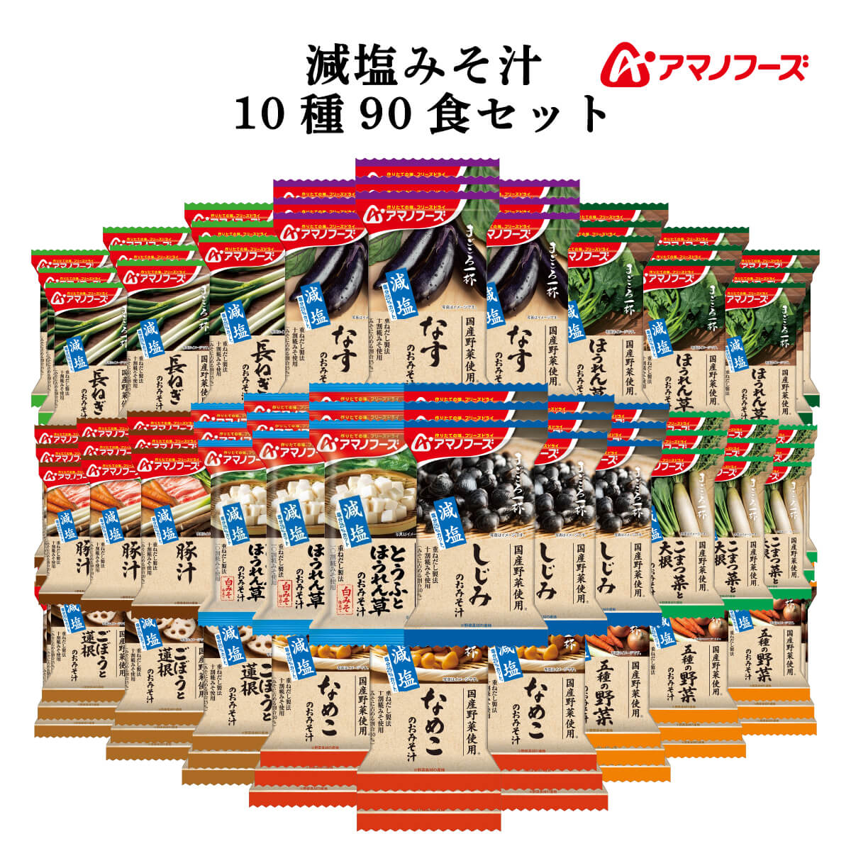 | 内容量 | ■ 減塩 まごころ一杯 減塩なす 10.7g 減塩しじみ 赤だし 15.7g 減塩とうふとほうれん草 9.2g 減塩ほうれん草 8.5g 減塩小松菜と大根 9.8g 減塩長ねぎ 8.7g 減塩とん汁 14.5g 減塩ごぼうと蓮根 9.4g 減塩なめこ 赤だし 8.2g 減塩五種の野菜 10.5g 10種 各9食 合計90食 |