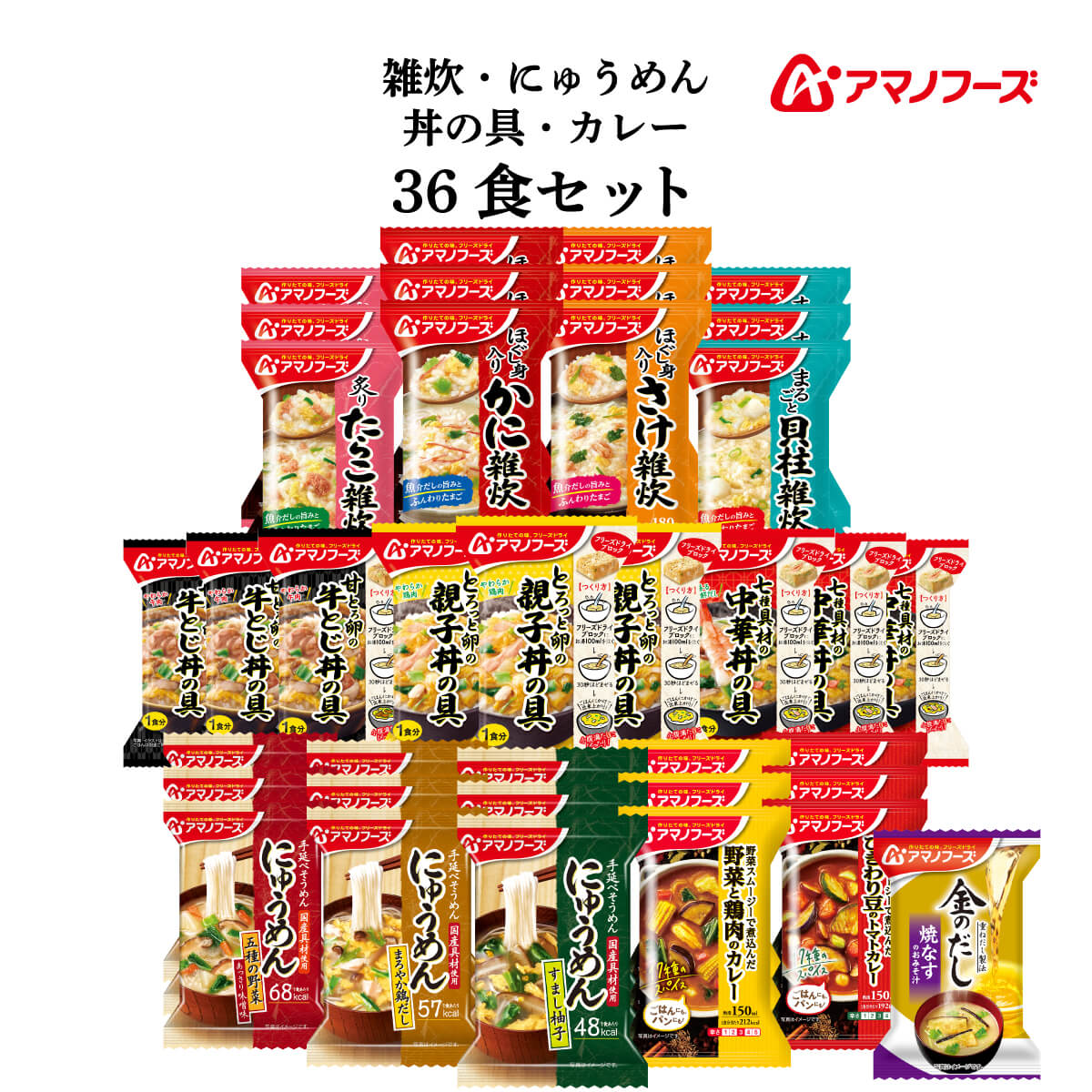 | 内容量 | ■ 雑炊 ほぐし身入り かに雑炊 20.5g ほぐし身入り さけ雑炊 20.7g 炙り たらこ雑炊 21g まるごと 貝柱雑炊 19.8g ■ にゅうめん すまし柚子 13g まろやか鶏だし 15g 五種の野菜 あっさりみそ味 18.5g ■ 丼の具 とろっと卵の親子丼の具 22.5g 甘とろ卵の牛とじ丼の具 23.8g 七種具材の中華丼の具 17g ■ カレー 野菜と鶏肉のカレー 36.4g ひきわり豆のトマトカレー 36g 12種 各3食 合計36食 + 金のだし なす 1食 |