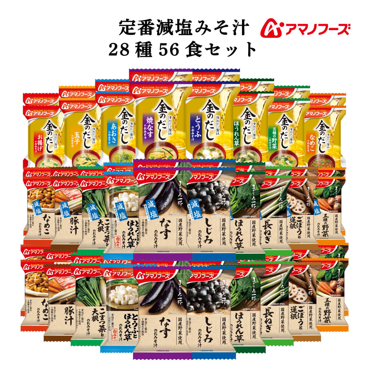 | 内容量 | ■ まごころ一杯 なす 9.8g しじみ 赤だし 15.9g とうふとほうれん草 9.5g ほうれん草 8.5g 小松菜と大根 9.3g 長ねぎ 8.2g とん汁 13.7g ごぼうと蓮根 9.1g なめこ 赤だし 8.3g 五種の野菜 10.5g ■ 減塩 まごころ一杯 減塩なす 10.7g 減塩しじみ 赤だし 15.7g 減塩とうふとほうれん草 9.2g 減塩ほうれん草 8.5g 減塩小松菜と大根 9.8g 減塩長ねぎ 8.7g 減塩とん汁 14.5g 減塩ごぼうと蓮根 9.4g 減塩なめこ 赤だし 8.2g 減塩五種の野菜 10.5g ■ 金のだし 焼なす 8.6g とうふ 8.4g あおさ 7.5g ほうれん草 8.4g 五種の野菜 8.5g 玉子 9.2g なめこ 赤だし 8.5g お揚げ 10g 28種 各2食 合計56食 |
