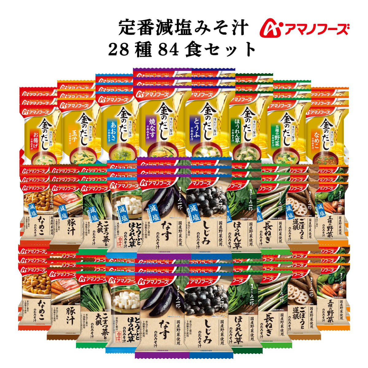 ![]() まごころ一杯(定番・減塩)・金のだし 28種28食 | ![]() まごころ一杯(定番・減塩)・金のだし 28種56食 |