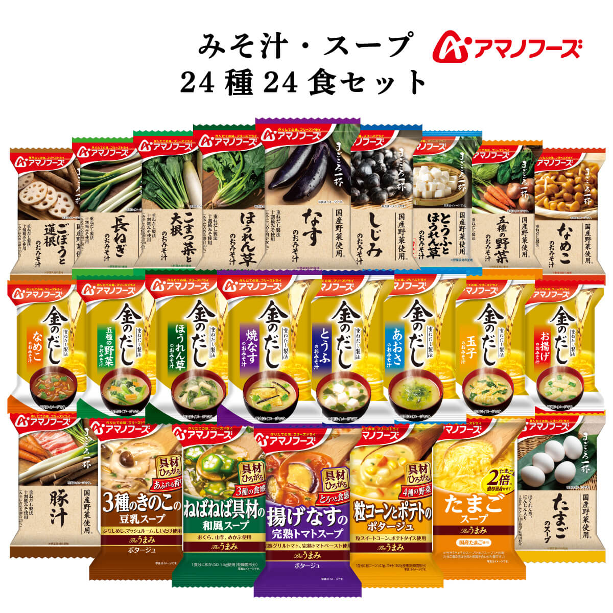 | 内容量 | ■ まごころ一杯 なす 9.8g ほうれん草 8.5g 小松菜と大根 9.3g 長ねぎ 8.2g ごぼうと蓮根 9.1g なめこ 赤だし 8.3g 五種の野菜 10.5g しじみ 赤だし 15.9g とん汁 13.7g とうふとほうれん草 9.5g たまごスープ 6.3g ■ 金のだし 焼なす 8.6g とうふ 8.4g あおさ 7.5g ほうれん草 8.4g 五種の野菜 8.5g 玉子 9.2g なめこ 赤だし 8.5g お揚げ 10g ■ Theうまみ たまごスープ 11g 揚げなすの完熟トマトスープ 10g 3種のねばねば具材の和風スープ 5g 粒コーンとポテトのポタージュ 19.8g 3種のきのこの豆乳スープ 9.3g 24種 24食 |