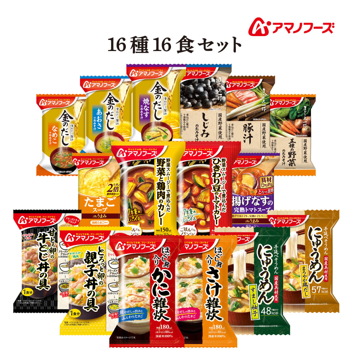 | 内容量 | ■ まごころ一杯 しじみ 赤だし 15.9g とん汁 13.7g 五種の野菜 10.5g ■ 金のだし なす 8.6g あおさ 7.5g なめこ 赤だし 8.5g ■ Theうまみ たまごスープ 11g 揚げなすの完熟トマトスープ 10g ■ 雑炊 ほぐし身入り かに雑炊 20.5g ほぐし身入り さけ雑炊 20.7g ■ にゅうめん すまし柚子 13g まろやか鶏だし 15g ■ 丼の具 とろっと卵の親子丼の具 22.5g 甘とろ卵の牛とじ丼の具 23.8g ■ カレー 野菜と鶏肉のカレー 36.4g ひきわり豆のトマトカレー 36g 16種 各1食 合計16食 |