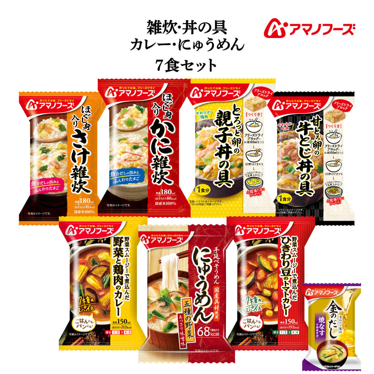 | 内容量 | ■ 雑炊 ほぐし身入り かに雑炊 20.5g ほぐし身入り さけ雑炊 20.7g ■ にゅうめん 五種の野菜 あっさりみそ味 18.5g ■ 丼の具 とろっと卵の親子丼の具 22.5g 甘とろ卵の牛とじ丼の具 23.8g ■ カレー 野菜と鶏肉のカレー 36.4g ひきわり豆のトマトカレー 36g 7種 各1食 合計7食 + 金のだし なす 1食 |