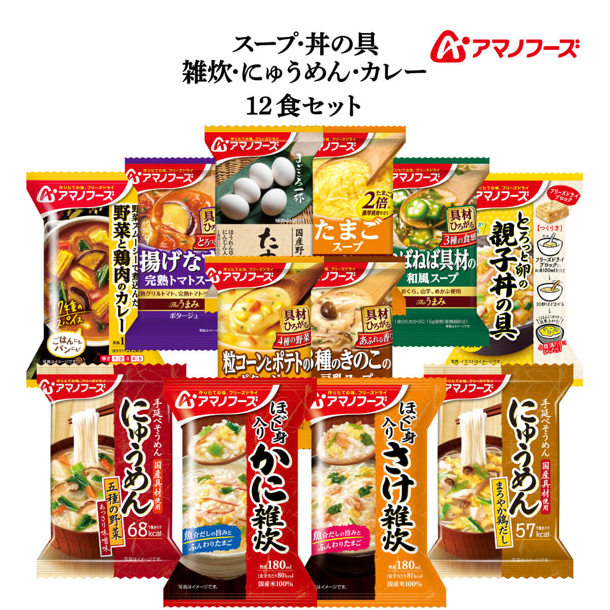 | 内容量 | ■ まごころ一杯 たまごスープ 6.3g ■ Theうまみ たまごスープ 11g 揚げなすの完熟トマトスープ 10g 3種のねばねば具材の和風スープ 5g 粒コーンとポテトのポタージュ 19.8g 3種のきのこの豆乳スープ 9.3g ■ 雑炊 ほぐし身入り かに雑炊 20.5g ほぐし身入り さけ雑炊 20.7g ■ にゅうめん まろやか鶏だし 15g 五種の野菜 あっさりみそ味 18.5g ■ 丼の具 とろっと卵の親子丼の具 22.5g ■ カレー 野菜と鶏肉のカレー 36.4g 12種 12食 |