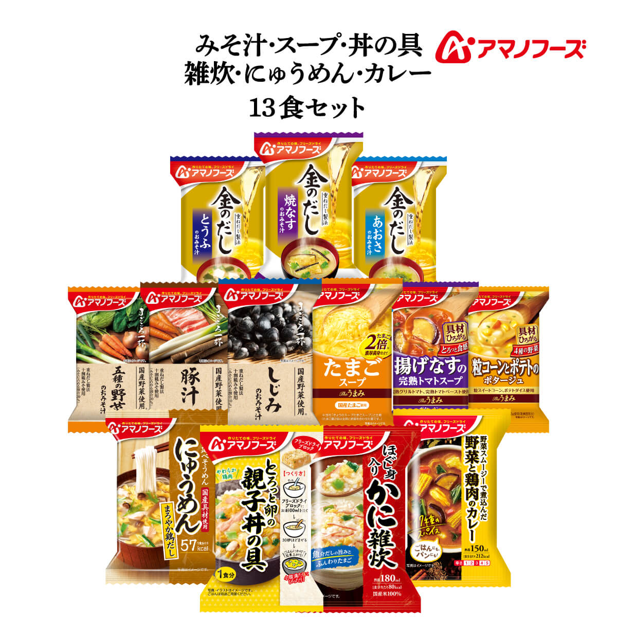 | 内容量 | ■ まごころ一杯 しじみ 赤だし 15.9g とん汁 13.7g 五種の野菜 10.5g ■ 金のだし なす 8.6g とうふ 8.4g あおさ 7.5g ■ Theうまみ たまごスープ 11g 揚げなすの完熟トマトスープ 10g 粒コーンとポテトのポタージュ 19.8g ■ 雑炊 ほぐし身入り かに雑炊 20.5g ■ にゅうめん まろやか鶏だし 15g ■ 丼の具 とろっと卵の親子丼の具 22.5g ■ カレー 野菜と鶏肉のカレー 36.4g 13種 各1食 合計13食 |