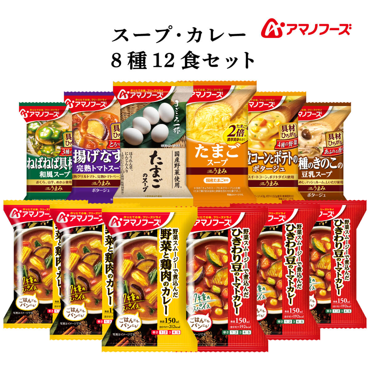 | 内容量 | ■ まごころ一杯 たまごスープ 6.3g ■ Theうまみ たまごスープ 11g 揚げなすの完熟トマトスープ 10g 3種のねばねば具材の和風スープ 5g 粒コーンとポテトのポタージュ 19.8g 3種のきのこの豆乳スープ 9.3g 各1食 ■ カレー 野菜と鶏肉のカレー 36.4g ひきわり豆のトマトカレー 36g 各3食 8種 合計12食 |