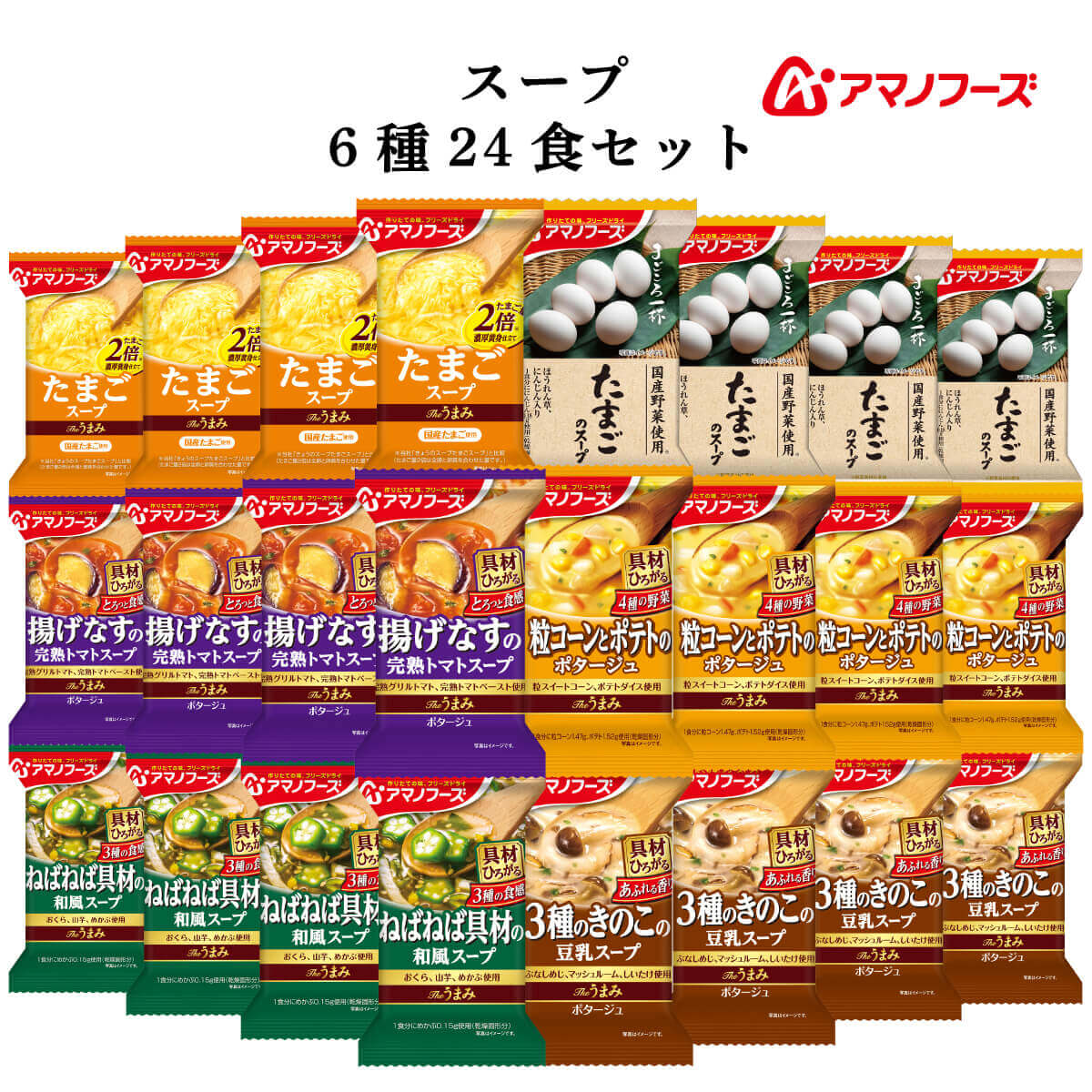 | 内容量 | ■ まごころ一杯 たまごスープ 6.3g ■ Theうまみ たまごスープ 11g 揚げなすの完熟トマトスープ 10g 3種のねばねば具材の和風スープ 5g 粒コーンとポテトのポタージュ 19.8g 3種のきのこの豆乳スープ 9.3g 6種 各4食 合計24食 |