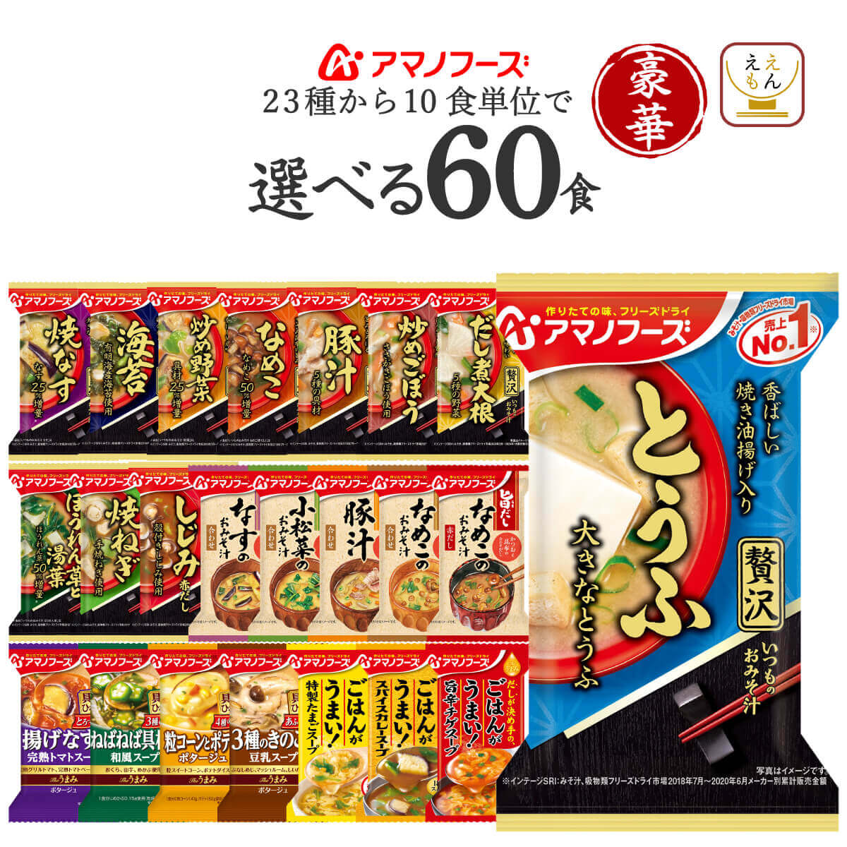 | 内容量 | ■ いつものおみそ汁 贅沢 焼なす 9.1g 海苔 7.5g とうふ 10.5g ほうれん草と湯葉 10.4g 焼ねぎ 8.7g 炒め野菜 11g 豚汁 12.5g なめこ 9g だし煮大根 9g 炒めごぼう 10.1g しじみ 赤だし 15g ■ 旨だし おみそ汁 なす汁 合わせ 9g こまつ菜 合わせ 9g 豚汁 12.5g なめこ 合わせ 8g なめこ 赤だし 8g ■ Theうまみ 揚げなすの完熟トマトスープ 10g 3種のねばねば具材の和風スープ 5g 粒コーンとポテトのポタージュ 19.8g 3種のきのこの豆乳スープ 9.3g ■ Theうまみ ごはんがうまい! 特製たまごスープ 7.0g スパイスカレースープ 8.7g 旨辛チゲスープ 8.9g 23種の中から10食単位で 好きなものを選べる6種60食セット |