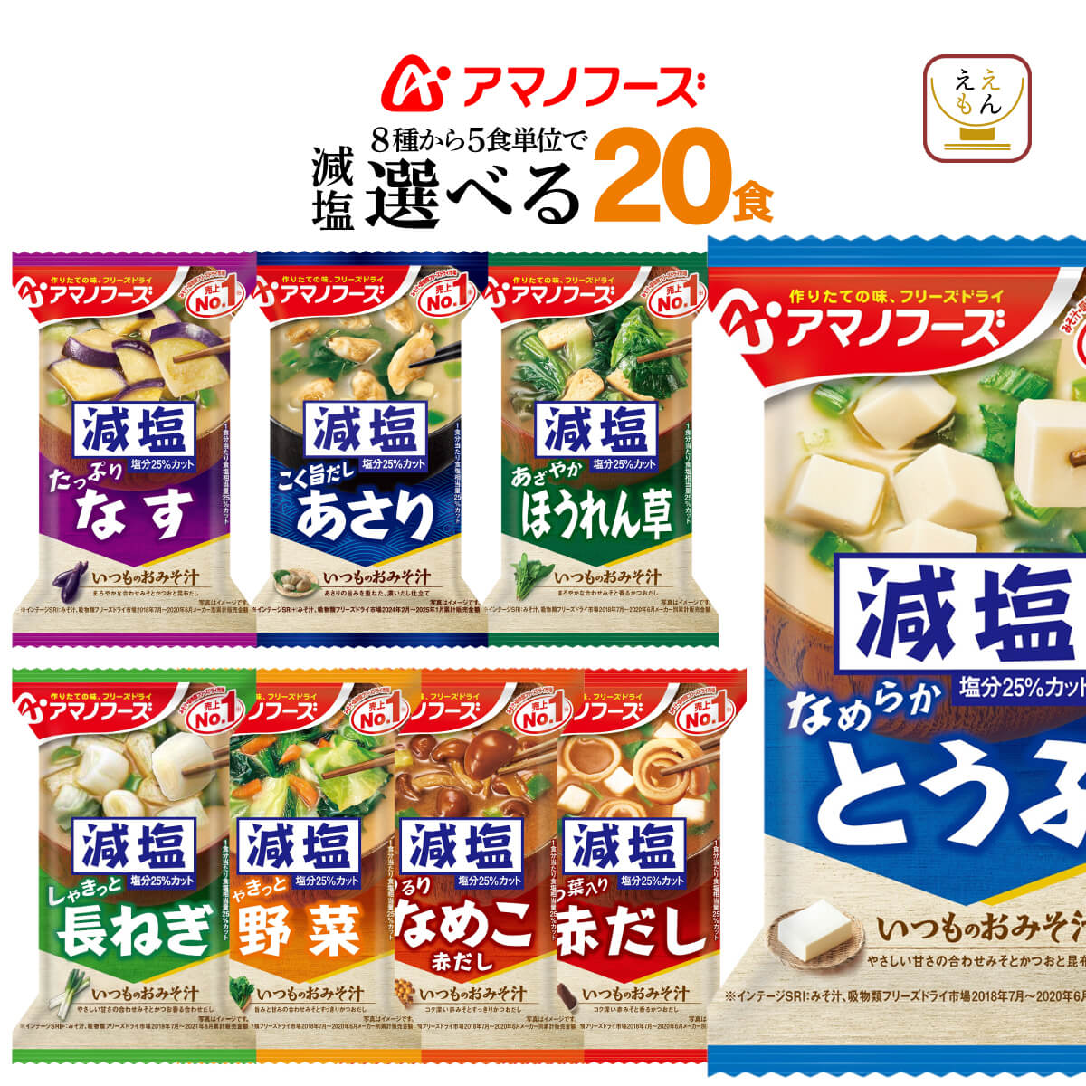 | 内容量 | ■ 減塩 いつものおみそ汁 減塩なす 9g 減塩あさり 7.5g 減塩とうふ 10.3g 減塩ほうれん草 6.8g 減塩長ねぎ 8.5g 減塩野菜 10.1g 減塩なめこ 赤だし 8g 減塩赤だし 三つ葉入り 8g 8種の中から5食単位で 好きなものを選べる4種20食セット |
