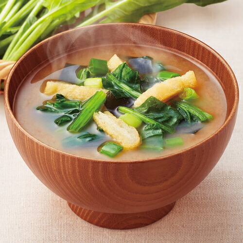 | 原材料 | ほうれんそう(エクアドル又はベトナム)、米みそ、豆乳、ねぎ、デキストリン、油揚げ、でん粉、調合みそ、風味調味料、乾燥わかめ、みりん、かつお節粉末、さば節粉末、酵母エキスパウダー/調味料(アミノ酸等)、凝固剤、酸化防止剤(ビタミンE)、酸味料、(一部にさば・大豆・魚醤(魚介類)を含む) |