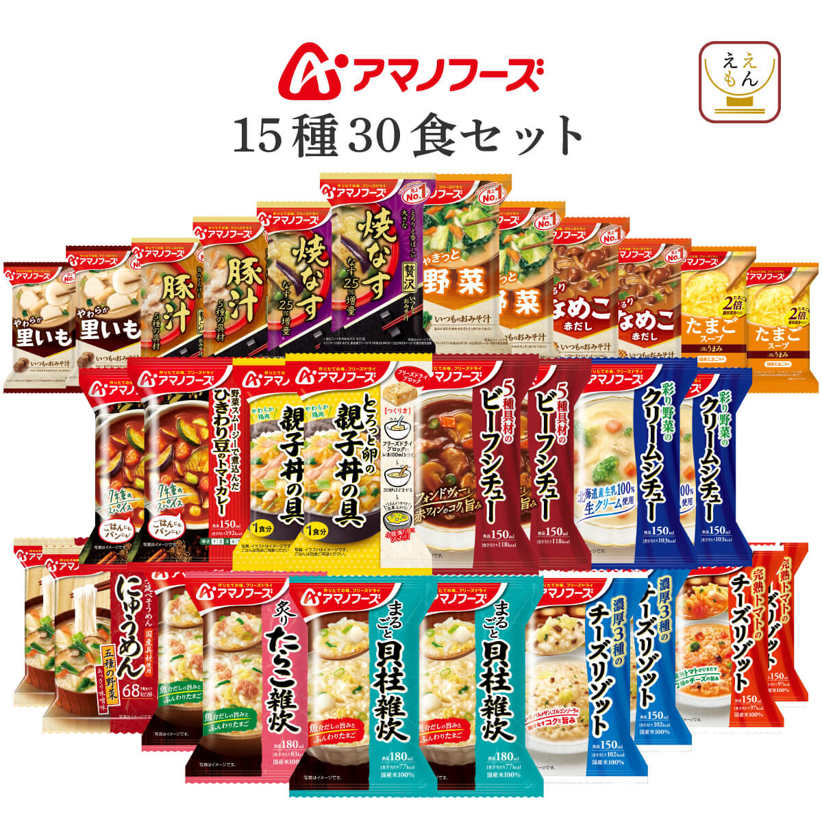 | 内容量 | ■ いつものおみそ汁 野菜 10g 里いも 9g なめこ 赤だし 8g ■ いつものおみそ汁 贅沢 焼なす 9.1g 豚汁 12.5g ■ Theうまみ たまごスープ 11g ■ 雑炊 炙り たらこ雑炊 21g まるごと 貝柱雑炊 19.8g ■ リゾット 濃厚3種のチーズリゾット 24g 完熟トマトのチーズリゾット 24.1g ■ にゅうめん 五種の野菜 あっさりみそ味 18.5g ■ 丼の具 とろっと卵の親子丼の具 22.5g ■ シチュー 彩り野菜のクリームシチュー 21.6g 5種具材のビーフシチュー 25.5g ■ カレー ひきわり豆のトマトカレー 36g 15種 各2食 30食 |