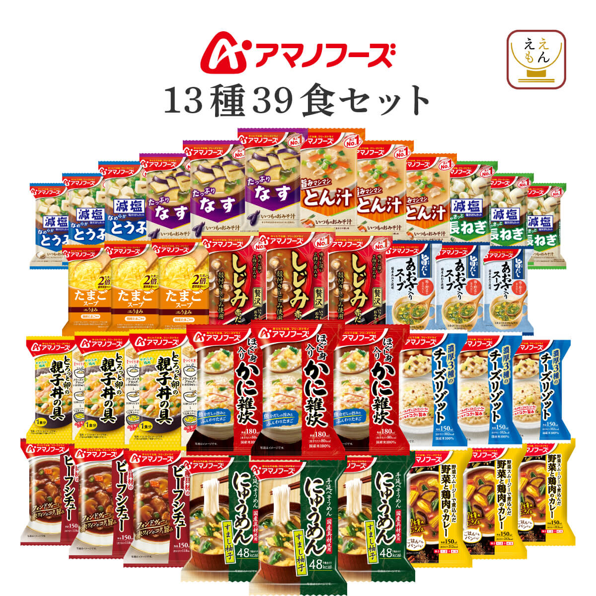 | 内容量 | ■ いつものおみそ汁 なす 9.5g とん汁 10.5g ■ いつものおみそ汁 贅沢 しじみ 赤だし 15g ■ 減塩 いつものおみそ汁 減塩とうふ 10.3g 減塩長ねぎ 8.5g ■ Theうまみ たまごスープ 11g ■ 旨だし スープ あおさスープ 5.5g ■ 雑炊 ほぐし身入り かに雑炊 20.5g ■ リゾット 濃厚3種のチーズリゾット 24g ■ にゅうめん すまし柚子 13g ■ 丼の具 とろっと卵の親子丼の具 22.5g ■ シチュー 5種具材のビーフシチュー 25.5g ■ カレー 野菜と鶏肉のカレー 36.4g 13種 各3食 合計39食 |