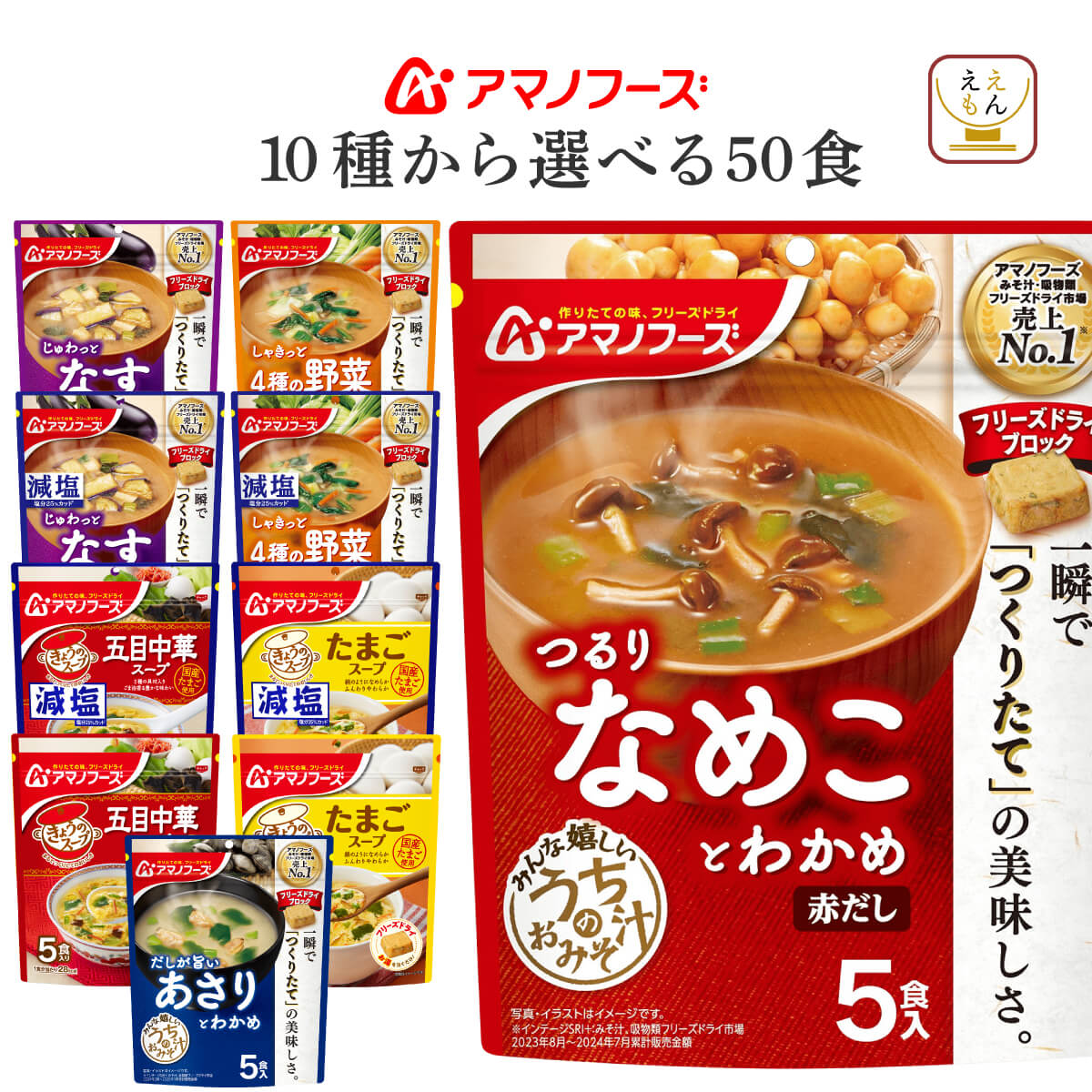 | 内容量 | ■ うちのおみそ汁 5食入 なすとお揚げ 44g あさりとわかめ 31g 4種の野菜 40.5g なめことわかめ(赤だし) 36.4g ■ 減塩 うちのおみそ汁 5食入 減塩なすとお揚げ 41.5g 減塩4種の野菜 38.5g ■ きょうのスープ 5食入 たまごスープ 36g 五目中華スープ 35g ■ 減塩 きょうのスープ 5食入 減塩たまごスープ 35g 減塩五目中華スープ 36.5g 10種類の中から10袋(50食)お選びいただけます。 |