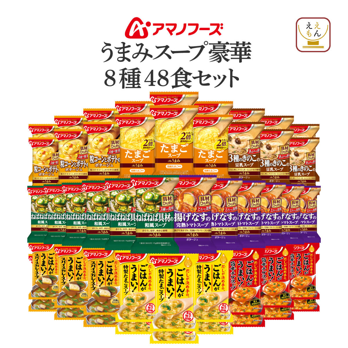 | 内容量 | ■ Theうまみ たまごスープ 11g 揚げなすの完熟トマトスープ 10g 3種のねばねば具材の和風スープ 5g 粒コーンとポテトのポタージュ 19.8g 3種のきのこの豆乳スープ 9.3g ■ Theうまみ ごはんがうまい! 特製たまごスープ 7.0g スパイスカレースープ 8.7g 旨辛チゲスープ 8.9g 8種 各6食 合計48食 |