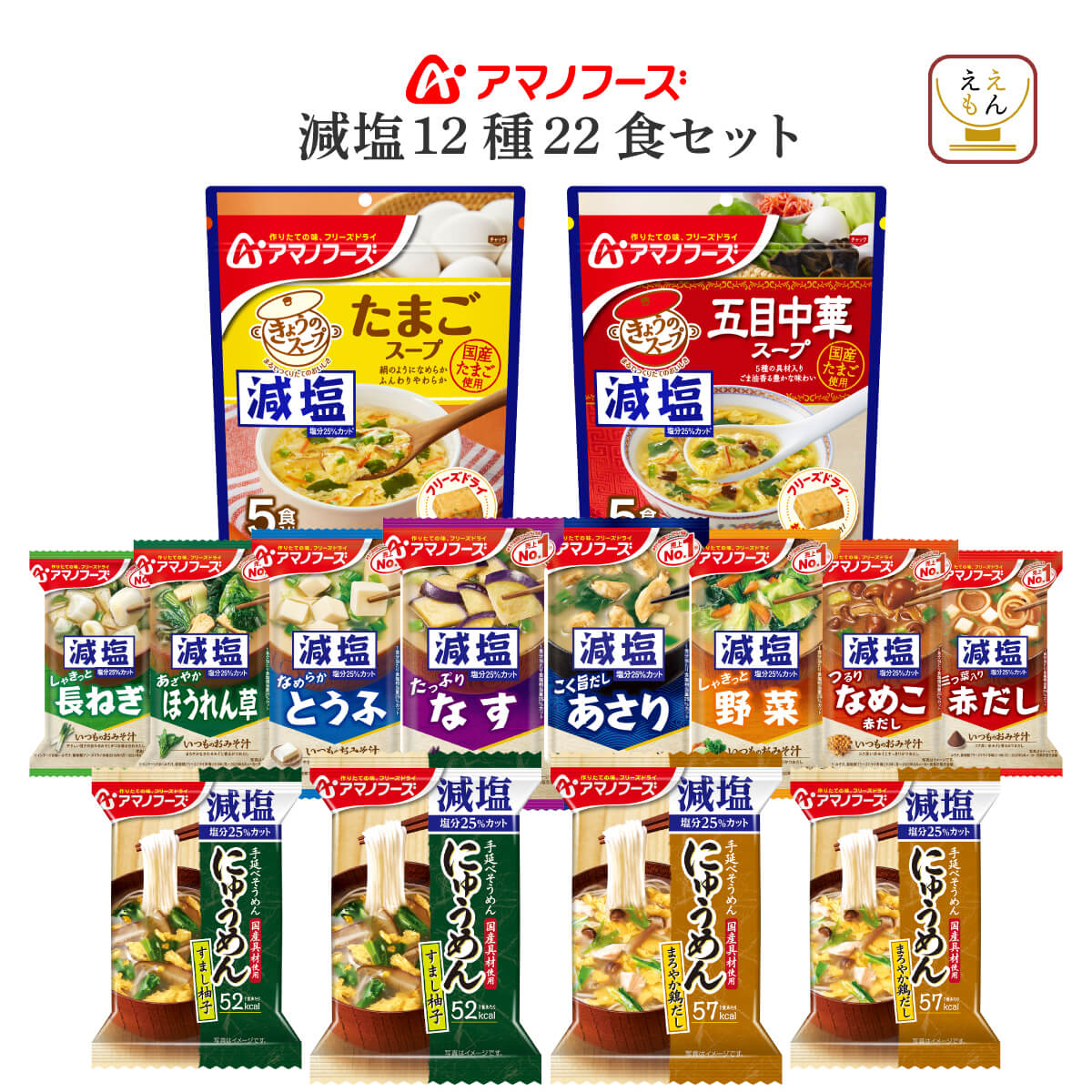 | 内容量 | ■ 減塩 いつものおみそ汁 減塩なす 9g 減塩あさり 7.5g 減塩とうふ 10.3g 減塩ほうれん草 6.8g 減塩長ねぎ 8.5g 減塩野菜 10.1g 減塩なめこ 赤だし 8g 減塩赤だし 三つ葉入り 8g 各1食 ■ 減塩 にゅうめん 減塩すまし柚子 12.9g 減塩まろやか鶏だし 14.5g 各2食 ■ 減塩 きょうのスープ 5食入 減塩たまごスープ 35g 減塩五目中華スープ 36.5g 各1袋 12種 22食 |