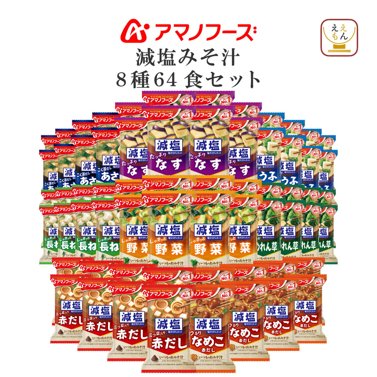 | 内容量 | ■ 減塩 いつものおみそ汁 減塩なす 9g 減塩あさり 7.5g 減塩とうふ 10.3g 減塩ほうれん草 6.8g 減塩長ねぎ 8.5g 減塩野菜 10.1g 減塩なめこ 赤だし 8g 減塩赤だし 三つ葉入り 8g 8種 各8食 合計64食 |