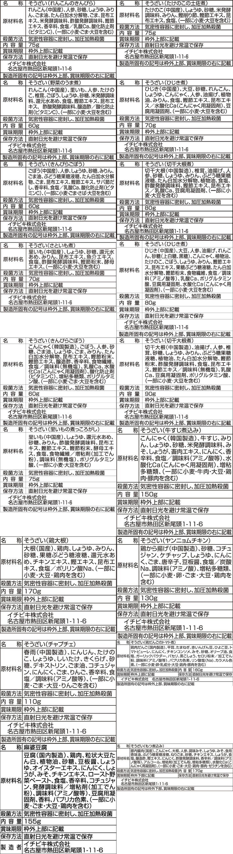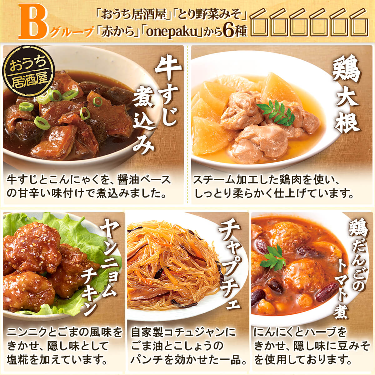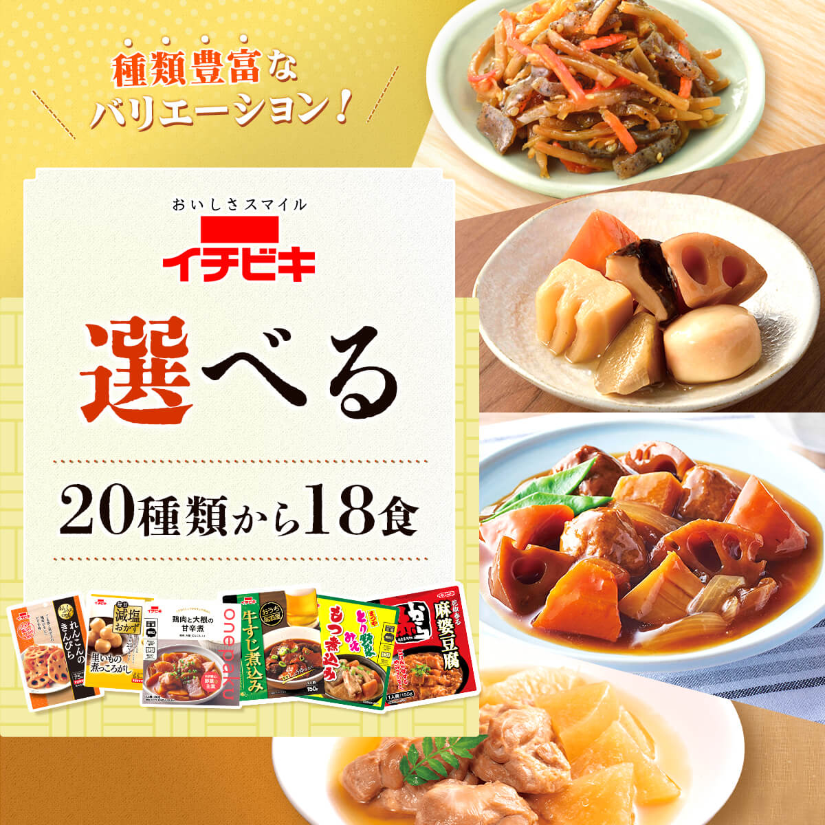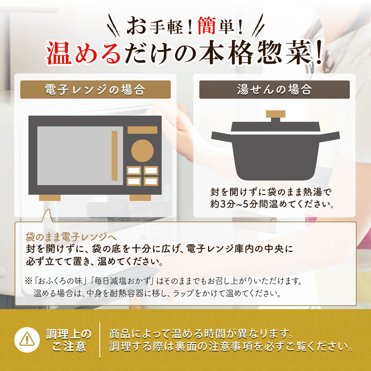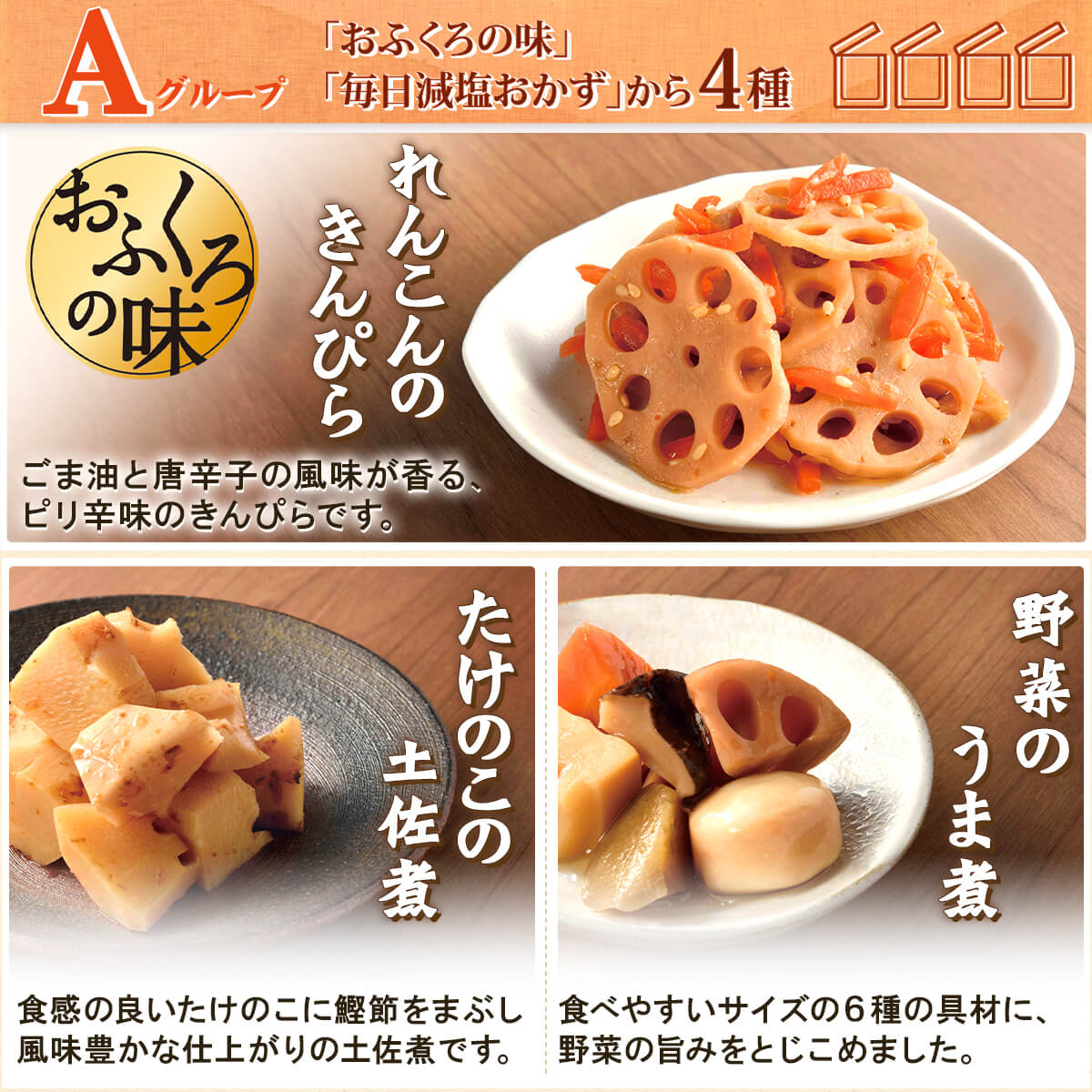 | 内容量 | ■ Aグループ(11種から3食単位で4種選べる) おふくろの味 れんこんのきんぴら 75g おふくろの味 たけのこの土佐煮 75g おふくろの味 野菜のうま煮 60g おふくろの味 ひじき煮 70g おふくろの味 きんぴらごぼう 60g おふくろの味 切干大根煮 80g おふくろの味 さといも煮 70g 毎日減塩おかず ひじき煮 80g 毎日減塩おかず きんぴらごぼう 60g 毎日減塩おかず 切干大根煮 90g 毎日減塩おかず 里いも煮っころがし 75g ■ Bグループ(9種から6種選べる) 牛すじ煮込み 150g 鶏大根 170g ヤンニョムチキン 130g チャプチェ 110g 鶏だんごのトマト煮 160g 赤から麻婆豆腐 155g とり野菜みそもつ煮込み 170g 肉団子と野菜の黒酢あん 190g 鶏肉と大根の甘辛煮 180g 20種の中から18食お選びください |