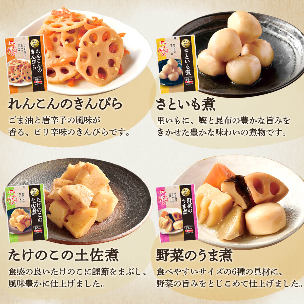 | 内容量 | ■ おふくろの味 れんこんのきんぴら 75g さといも煮 70g たけのこの土佐煮 75g 野菜のうま煮 60g ひじき煮 70g きんぴらごぼう 60g 切干大根煮 80g 7種 各6食 合計42食 製造メーカーからの仕入商品の為 賞味期限はお届け時のものではございません。 予めご了承くださいませ。 |