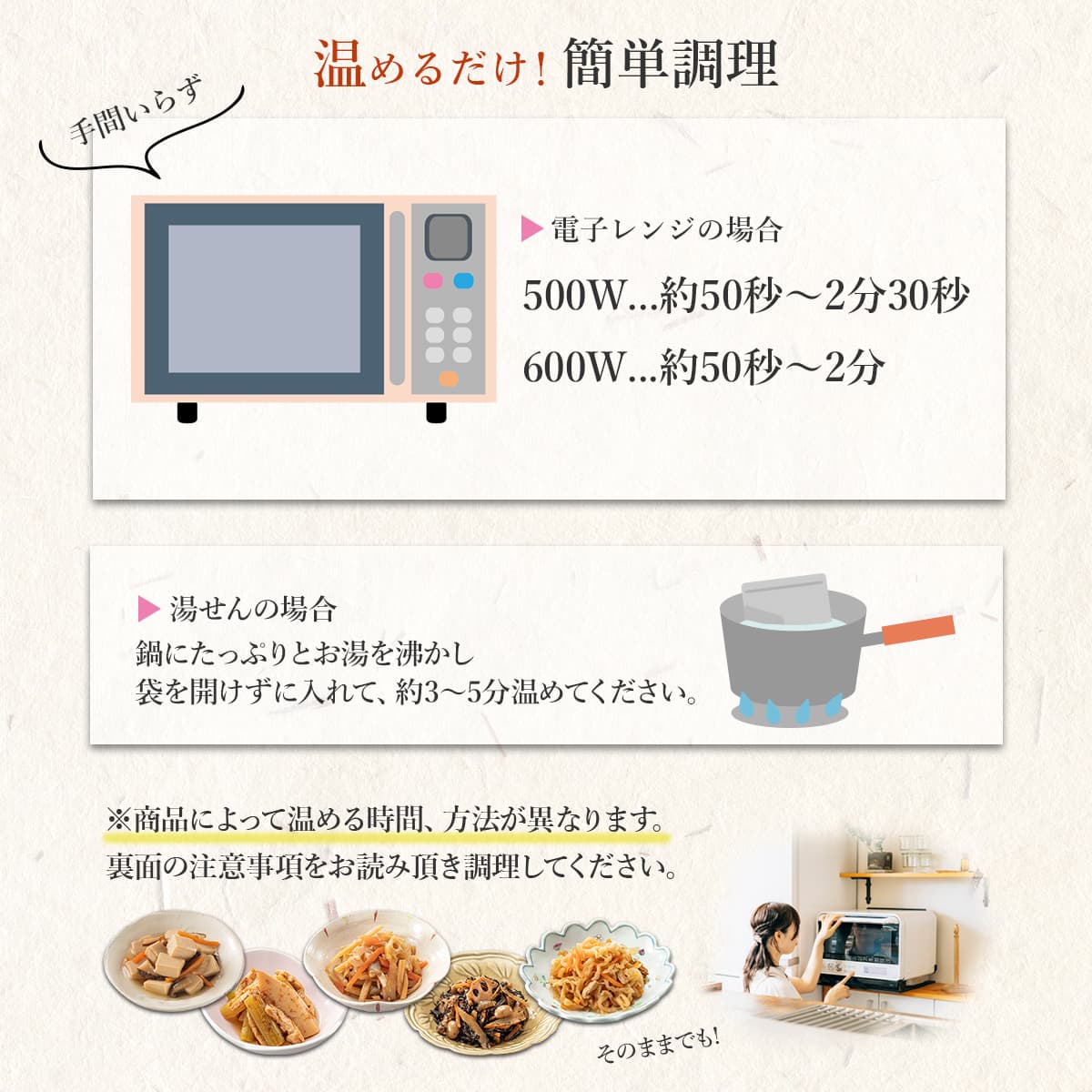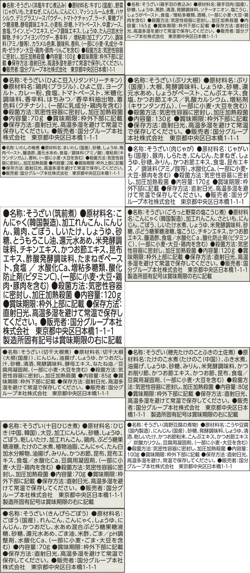 | 内容量 ※賞味期限 | まごころを食卓に 膳 ■ 製造日より 365日 鶏手羽の黒酢煮 165g ぶり大根 130g いわしの梅煮 2尾 ■ 製造日より 270日 洋風牛すじ煮込み 100g ひよこ豆入りタンドリーチキン 70g ■ 製造日より 241日 高野豆腐の含め煮 100g ■ 製造日より 240日 肉じゃが 170g 筑前煮 120g ごろっと野菜の塩こうじ煮 120g 切干大根煮 85g 穂先たけのことふきの土佐煮 80g 十目ひじき煮 70g ■ 製造日より 180日 4種具材のきんぴらごぼう 70g 13種の中から10食お選びください 製造メーカーからの仕入商品の為 賞味期限はお届け時のものではございません。 予めご了承くださいませ。 |