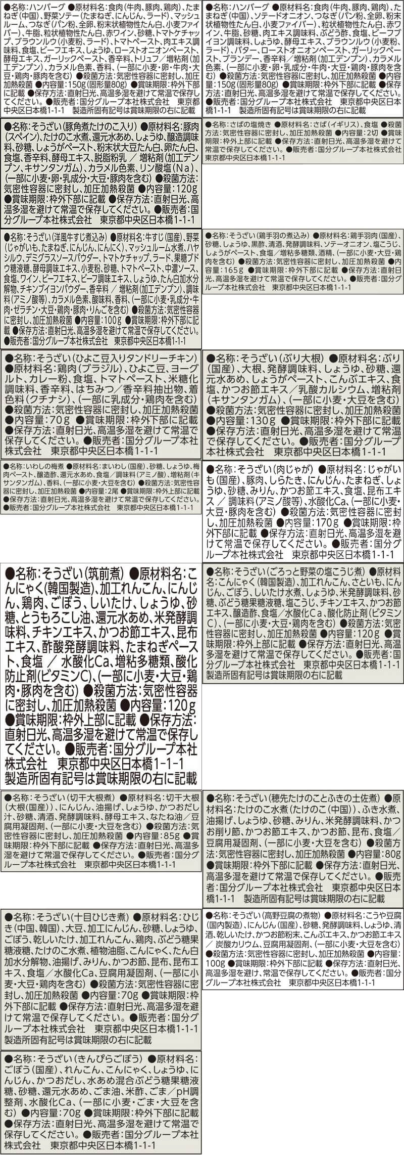 | 内容量 ※賞味期限 | まごころを食卓に 膳 ■ 製造日より 365日 ハンバーグ デミグラスソース 150g 鶏手羽の黒酢煮 165g さばの塩焼き 2切 ぶり大根 130g いわしの梅煮 2尾 ■ 製造日より 270日 ハンバーグ シャリアピンソース 150g 洋風牛すじ煮込み 100g ひよこ豆入りタンドリーチキン 70g ■ 製造日より 241日 高野豆腐の含め煮 100g ■ 製造日より 240日 豚の角煮 たけのこ入り 120g 肉じゃが 170g 筑前煮 120g ごろっと野菜の塩こうじ煮 120g 切干大根煮 85g 穂先たけのことふきの土佐煮 80g 十目ひじき煮 70g ■ 製造日より 180日 4種具材のきんぴらごぼう 70g 17種の中から10食お選びください 製造メーカーからの仕入商品の為 賞味期限はお届け時のものではございません。 予めご了承くださいませ。 |
