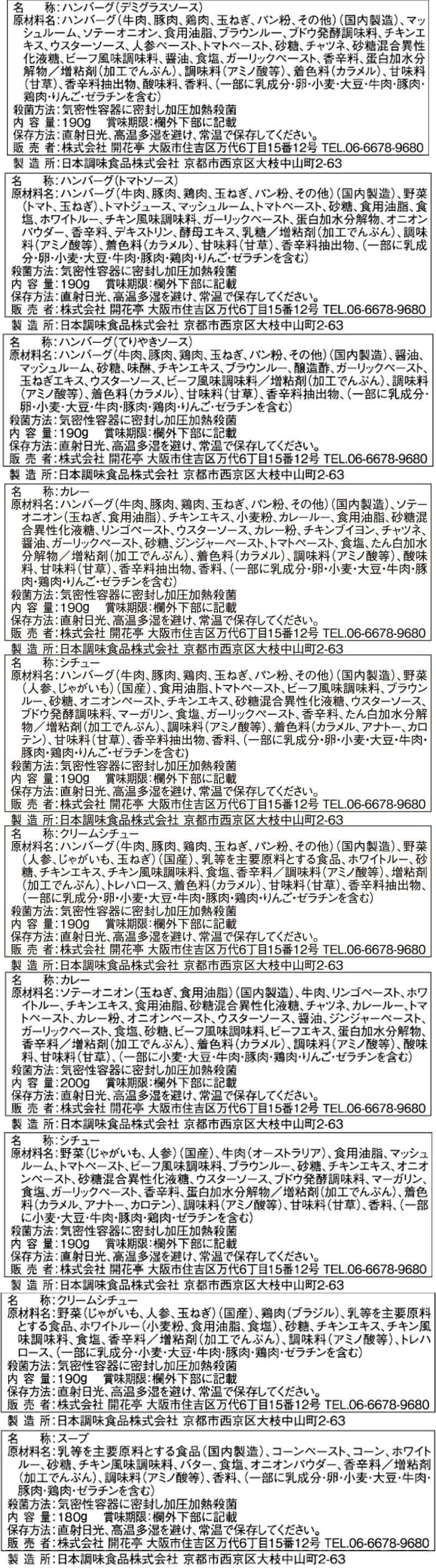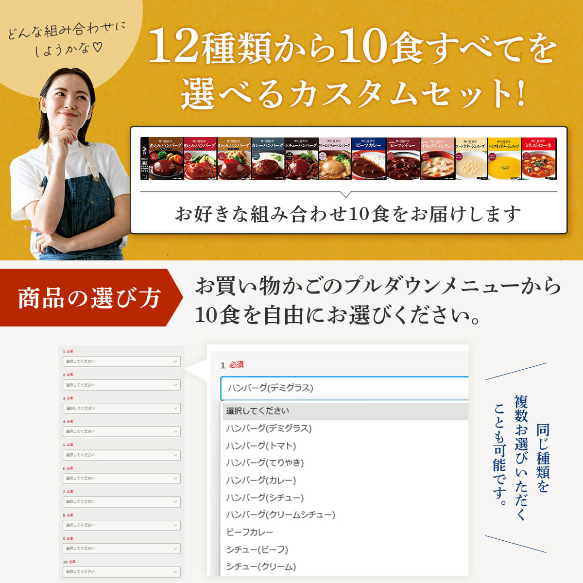 | 内容量 | 煮込みハンバーグ デミグラスソース 190g 煮込みハンバーグ トマトソース 190g 煮込みハンバーグ てりやきソース 190g カレーハンバーグ 190g シチューハンバーグ 190g クリームシチューハンバーグ 190g ビーフカレー 200g ビーフシチュー 190g チキンクリームシチュー 190g コーンポタージュスープ 180g パンプキンポタージュスープ 180g ミネストローネ 180g 12種類の中から10食お選びいただけます。 |