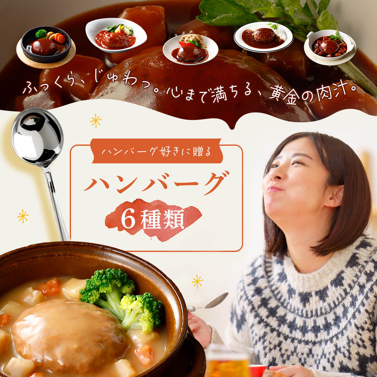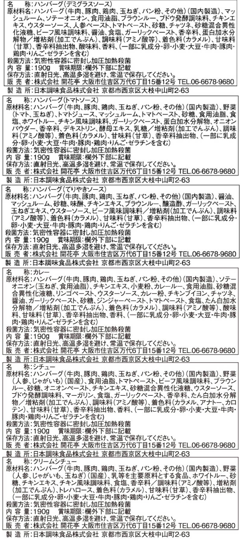 | 内容量 | 煮込みハンバーグ デミグラスソース 190g 煮込みハンバーグ トマトソース 190g 煮込みハンバーグ てりやきソース 190g カレーハンバーグ 190g シチューハンバーグ 190g クリームシチューハンバーグ 190g 6種 各2食 合計12食 |