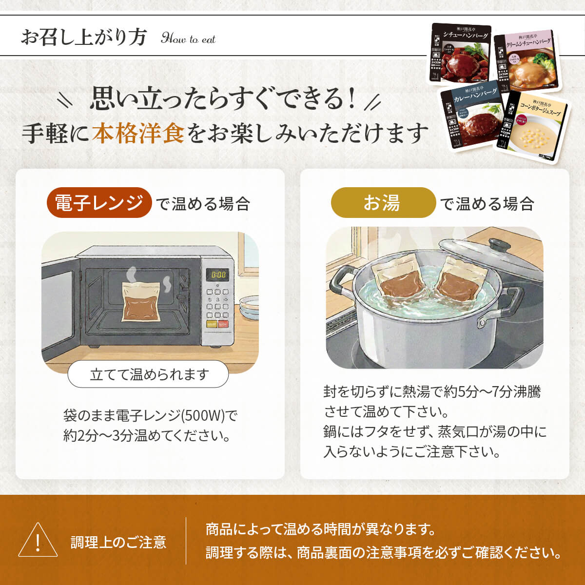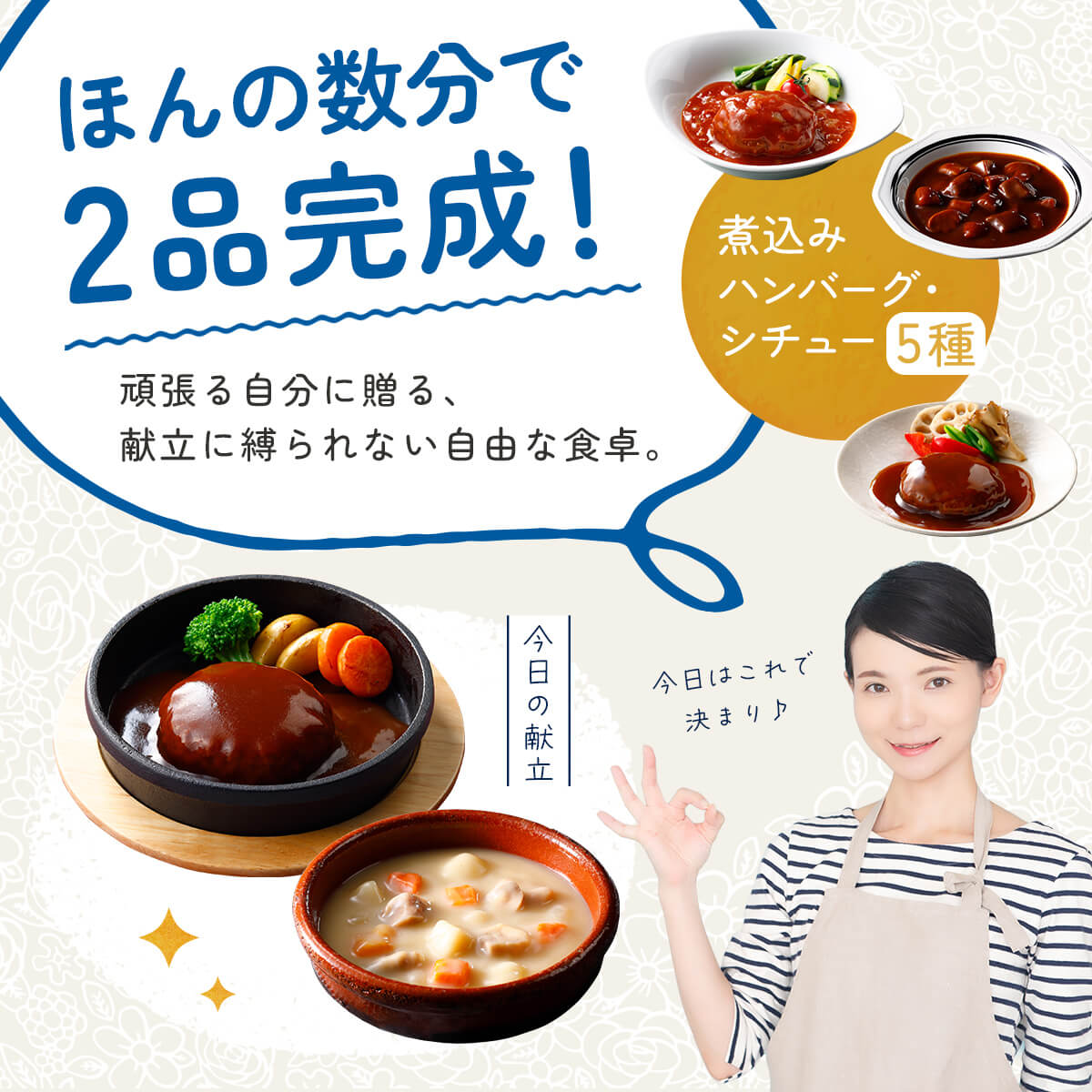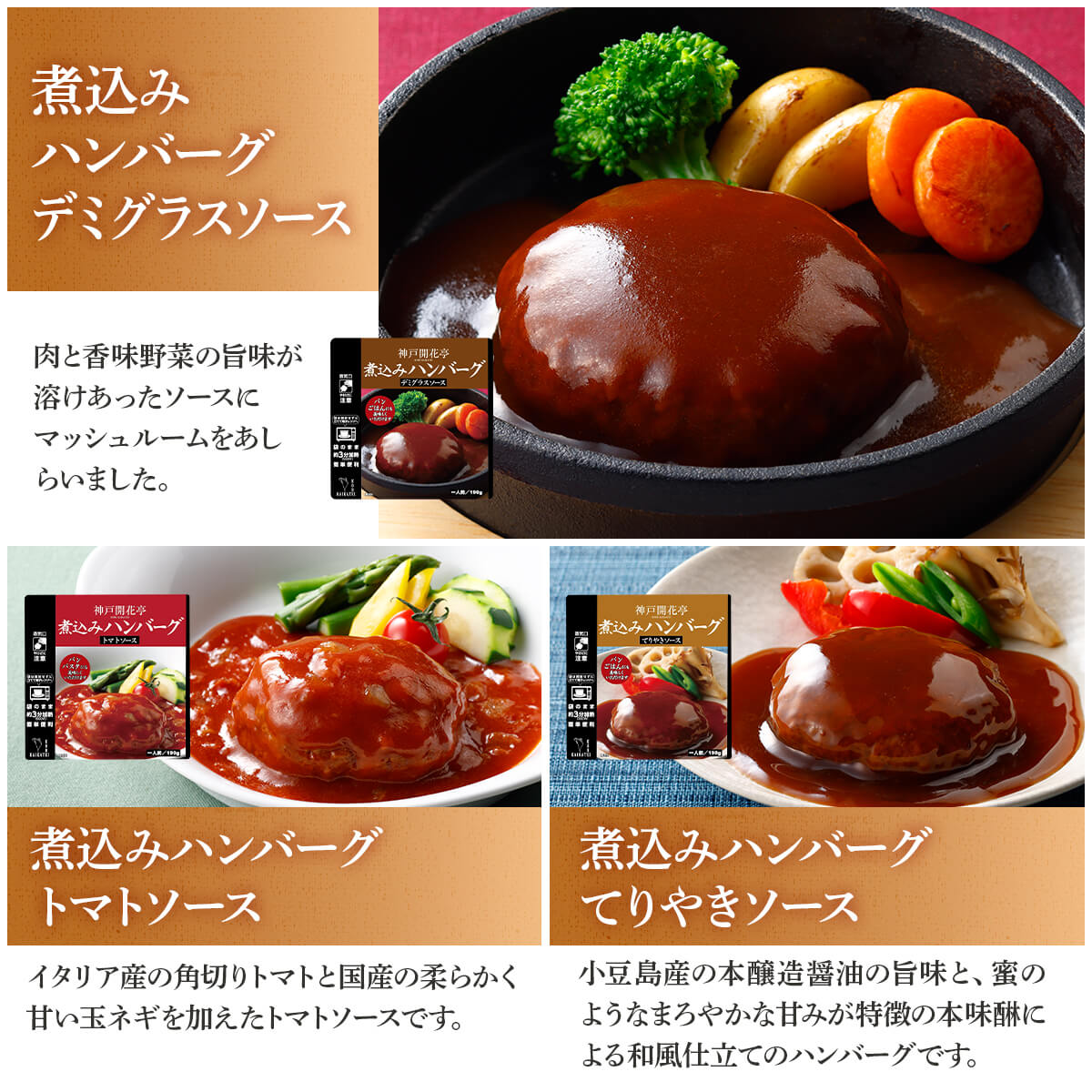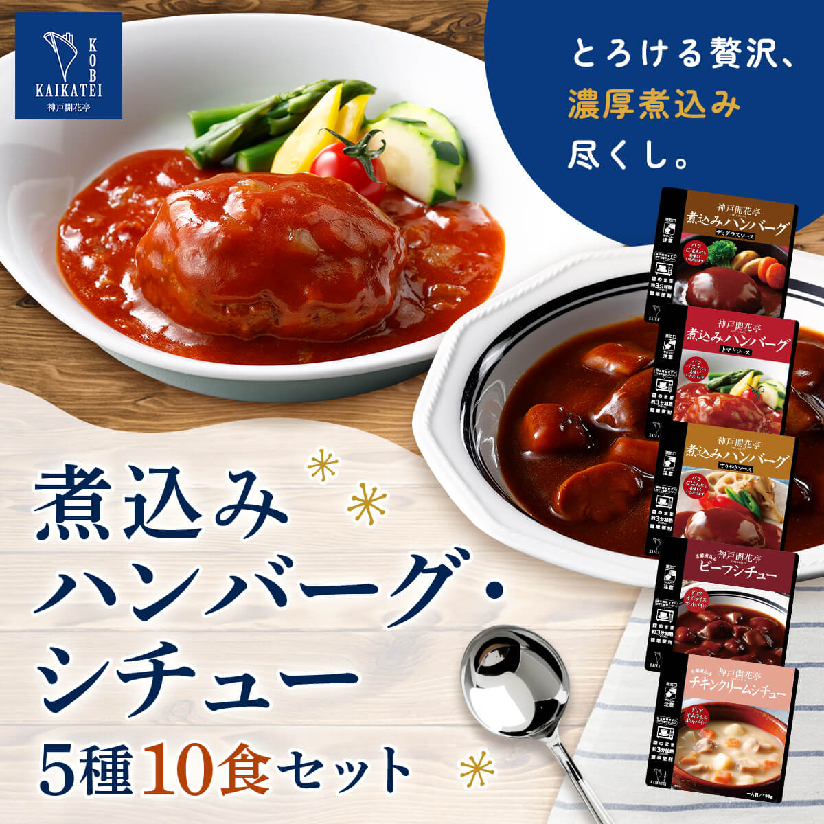 | 内容量 | 煮込みハンバーグ デミグラスソース 190g 煮込みハンバーグ トマトソース 190g 煮込みハンバーグ てりやきソース 190g ビーフシチュー 190g チキンクリームシチュー 190g 5種 各2食 合計10食 |