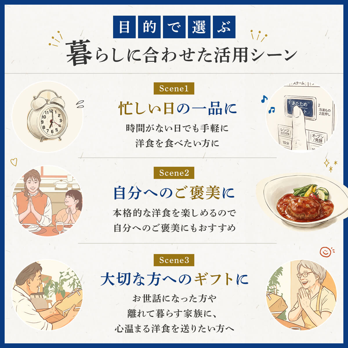 ![]() ハンバーグ・スープ 5種10食セット | ![]() ハンバーグ 6種12食セット |