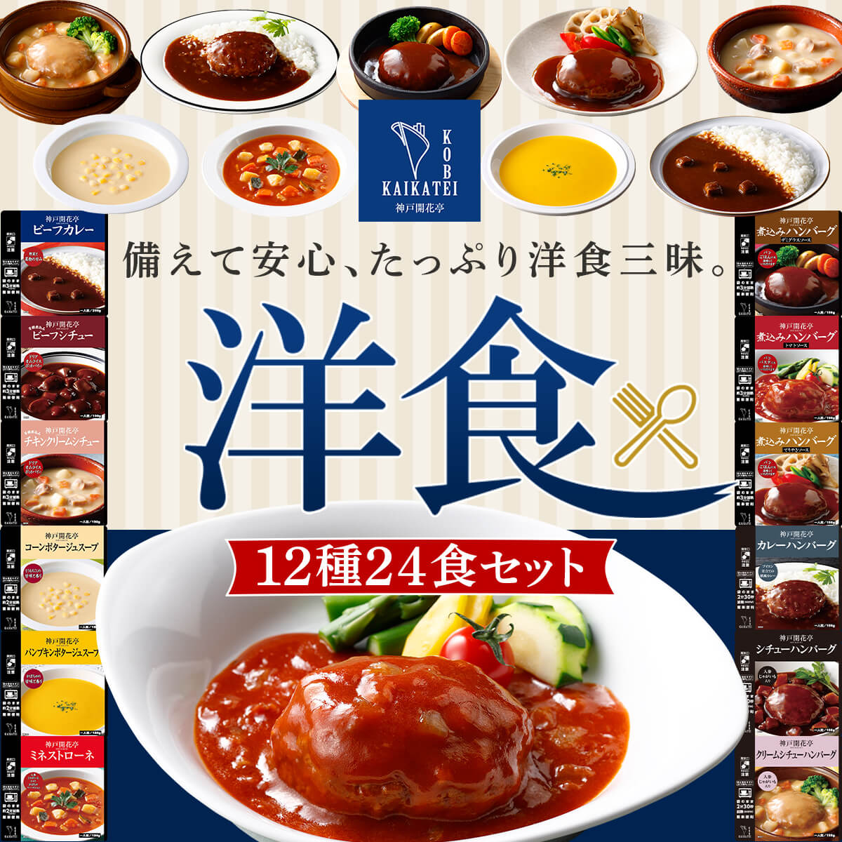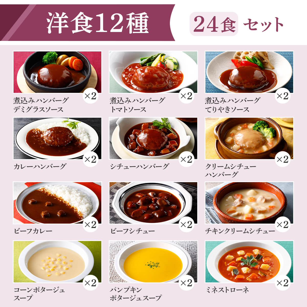| 内容量 | 煮込みハンバーグ デミグラスソース 190g 煮込みハンバーグ トマトソース 190g 煮込みハンバーグ てりやきソース 190g カレーハンバーグ 190g シチューハンバーグ 190g クリームシチューハンバーグ 190g ビーフカレー 200g ビーフシチュー 190g チキンクリームシチュー 190g コーンポタージュスープ 180g パンプキンポタージュスープ 180g ミネストローネ 180g 12種 各2食 合計24食 |