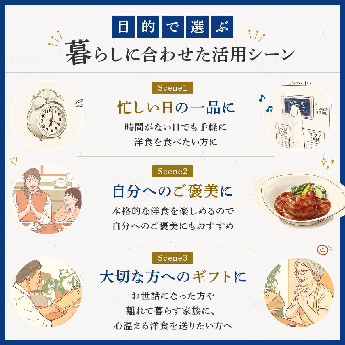 | リニューアル内容 | 下記商品を追加し、9種18食から12種24食に変更しました。 カレーハンバーグ 190g シチューハンバーグ 190g クリームシチューハンバーグ 190g |