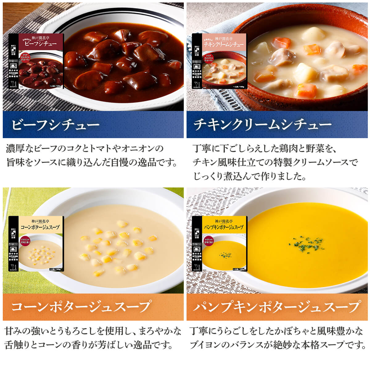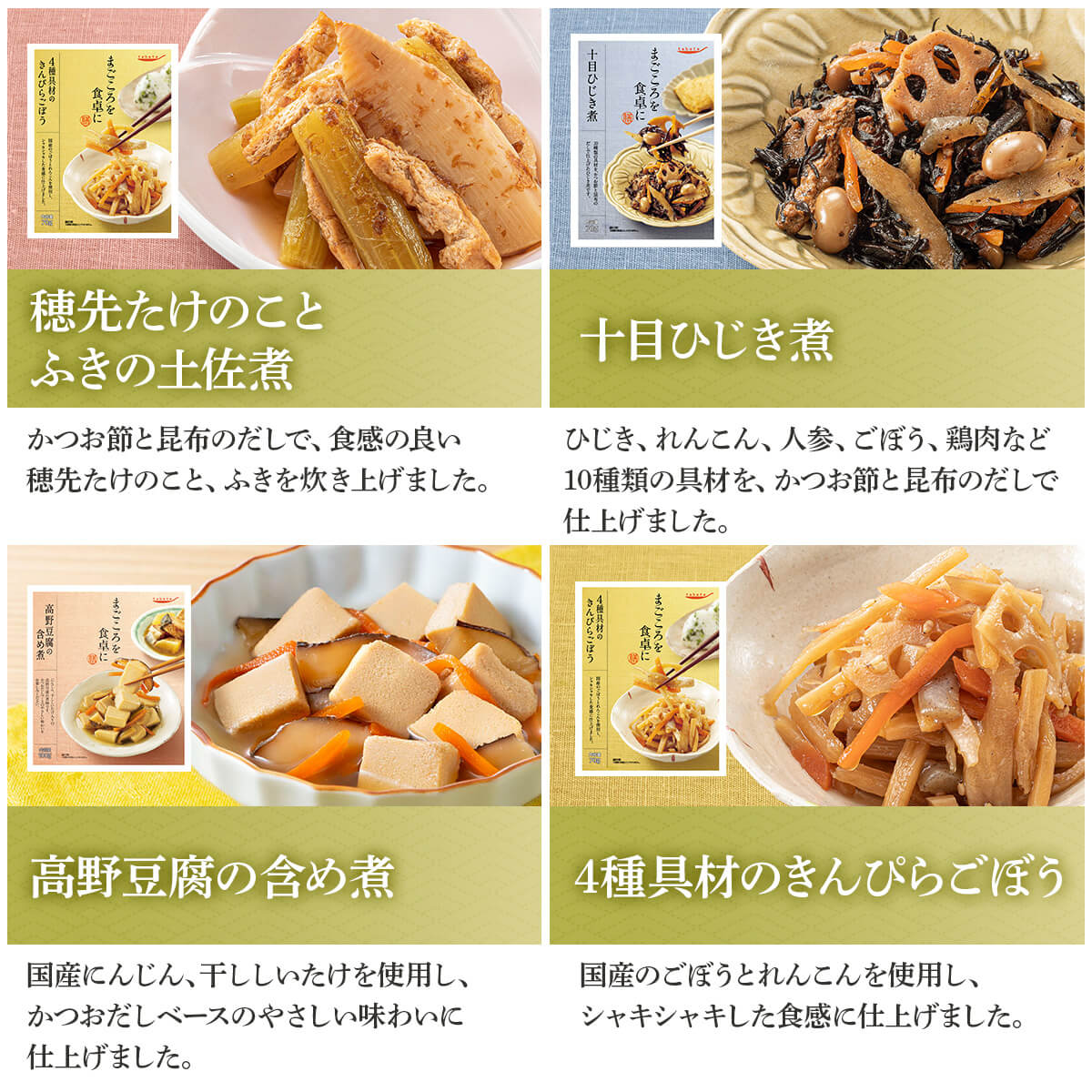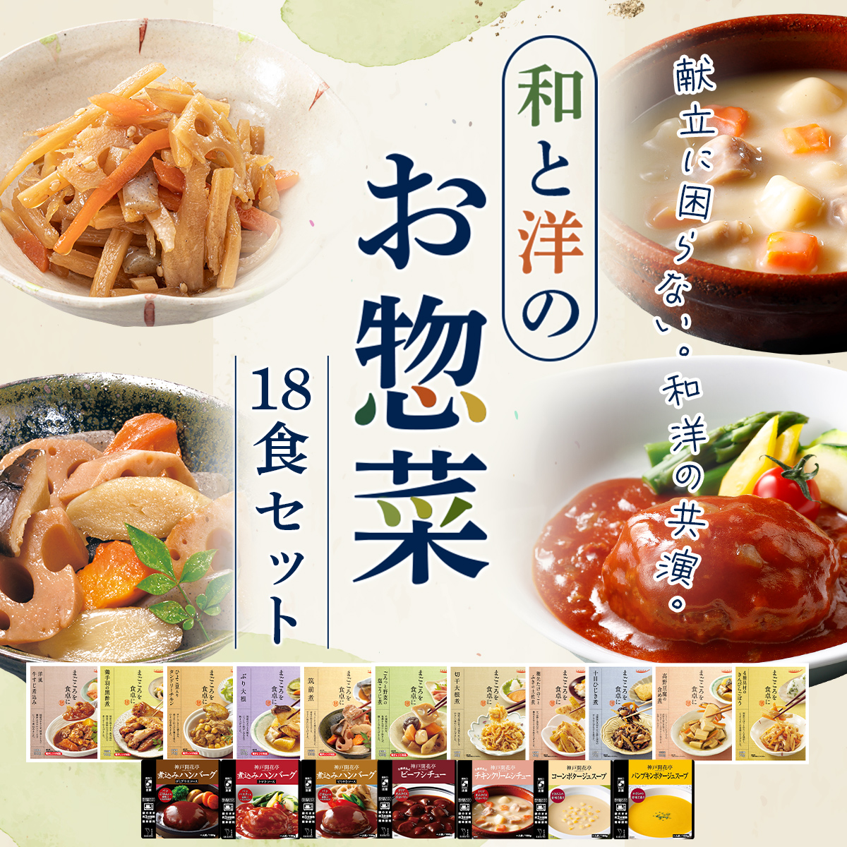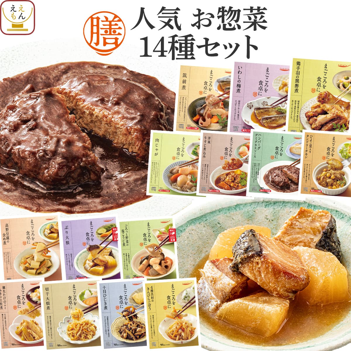 ![]() ハンバーグ・スープ 5種10食セット | ![]() 膳 14種 |
