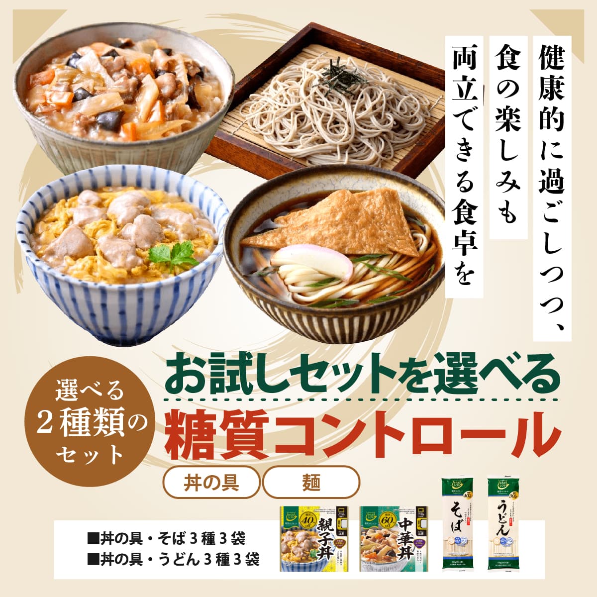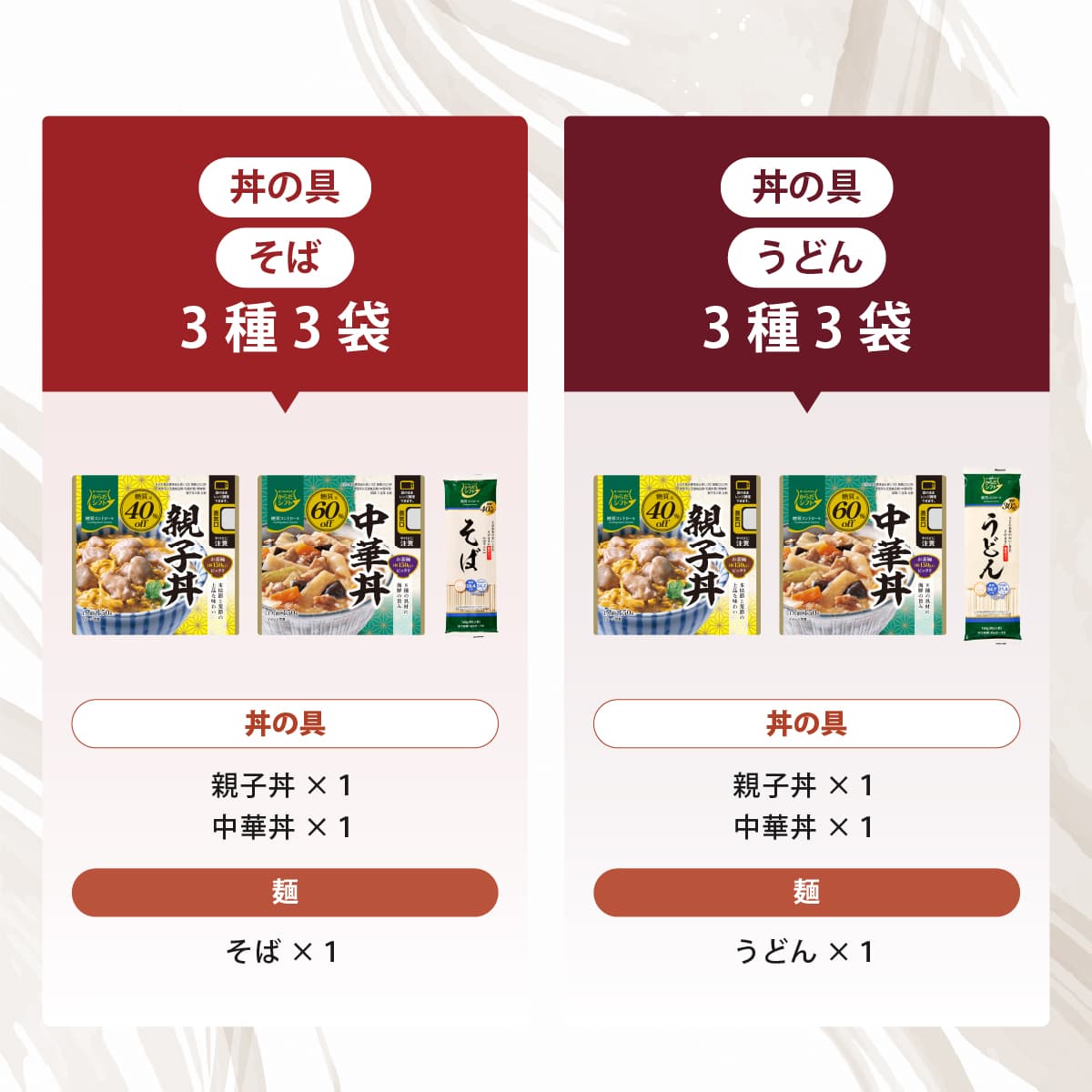 | 内容量 ※賞味期限 | ■ 丼の具・そば 3種3袋セット ▽ 糖質コントロール 親子丼 150g×1 中華丼 150g×1 そば 160g×1 ※製造日より1年(12ヶ月) ■ 丼の具・うどん 3種3袋セット ▽ 糖質コントロール 親子丼 150g×1 中華丼 150g×1 うどん 160g×1 ※製造日より1年(12ヶ月) 2種類のセットからお選びいただけます。 製造メーカーからの仕入商品の為 賞味期限はお届け時のものではございません。 予めご了承くださいませ。 |