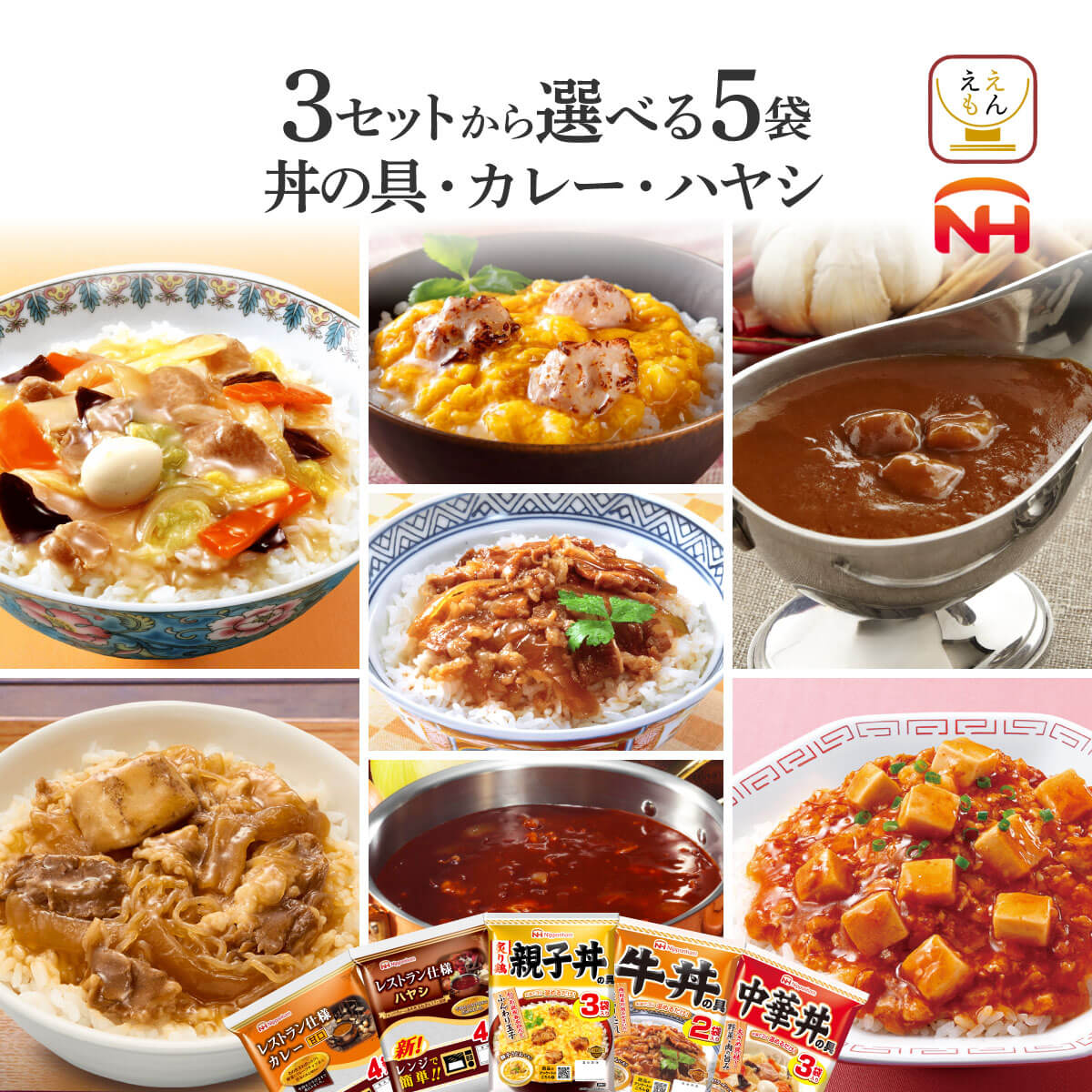 ![]() セットで選べる カレー・ハヤシ12食 | ![]() 選べる 5袋 丼の具 |