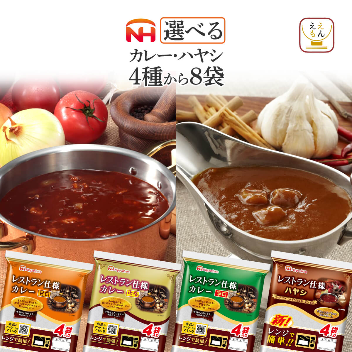 | 内容量 | ■ レストラン仕様 (1袋 4食入) カレー 甘口 170g カレー 中辛 170g カレー 辛口 170g ハヤシ 135g 4種類の中から8袋お選びいただけます。 |